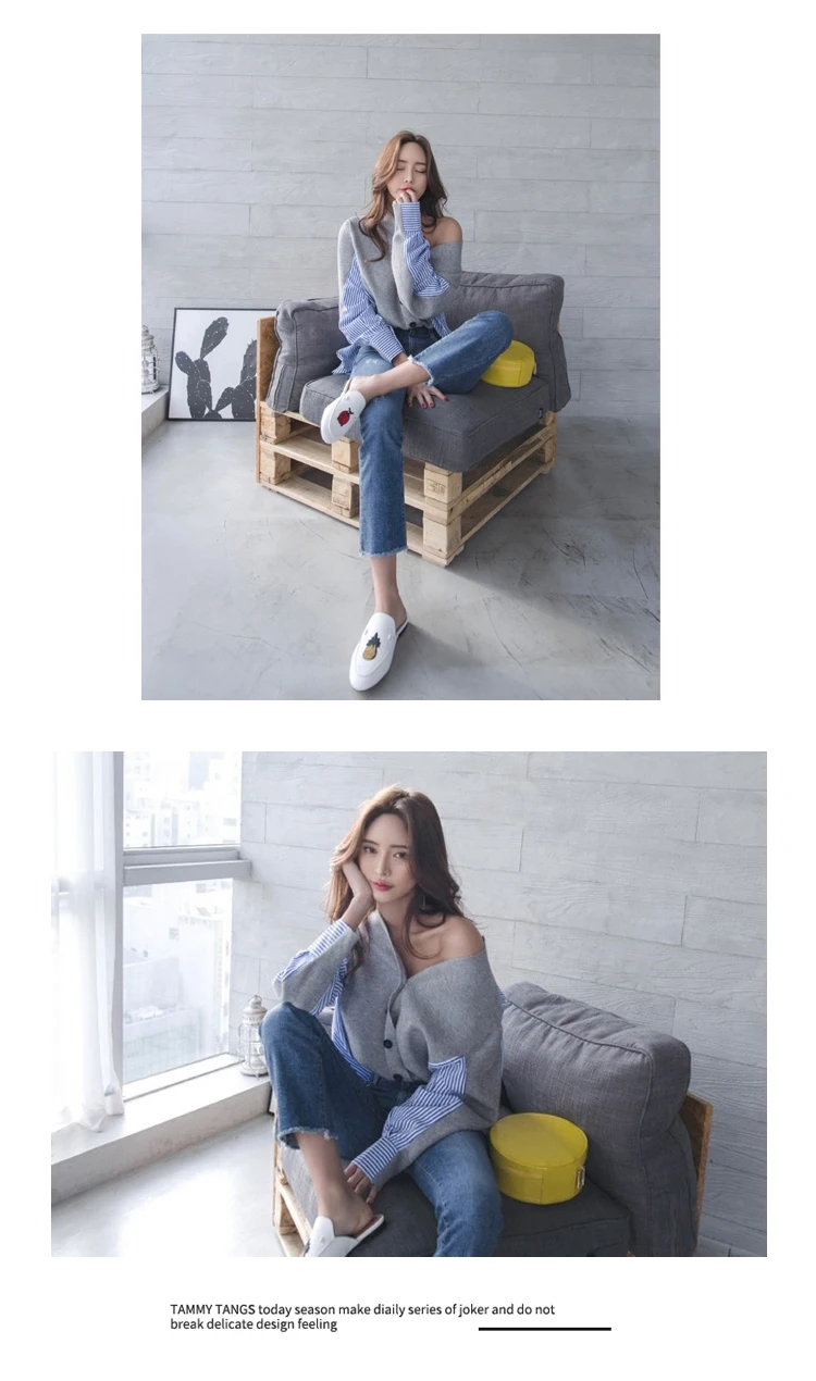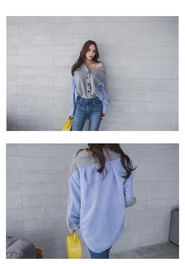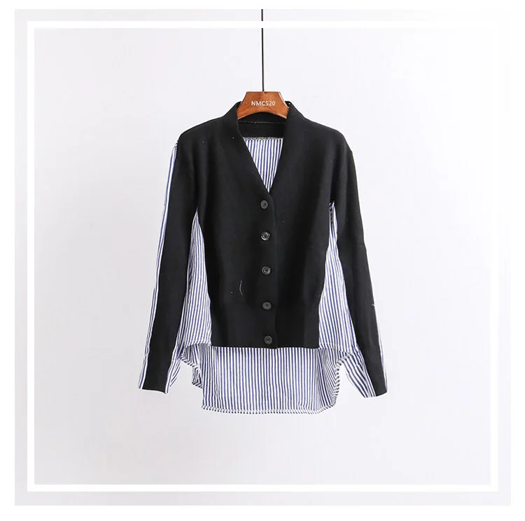 Женский свитер в стиле пэчворк, кардиган на пуговицах, шерстяной Милый джемпер с V-образным вырезом, черные и серые свитера, повседневные женские осенние вязаные топы в полоску