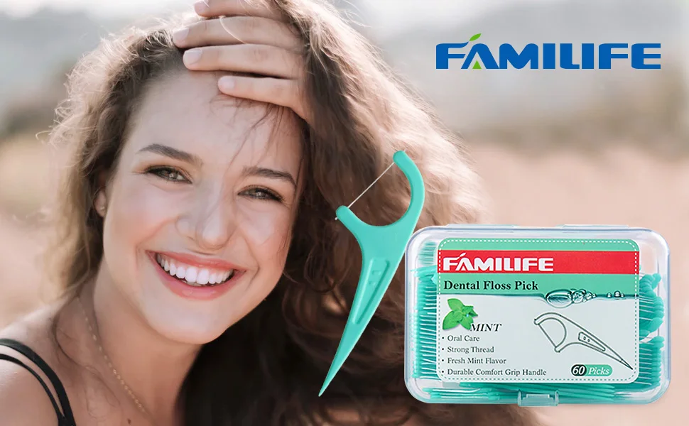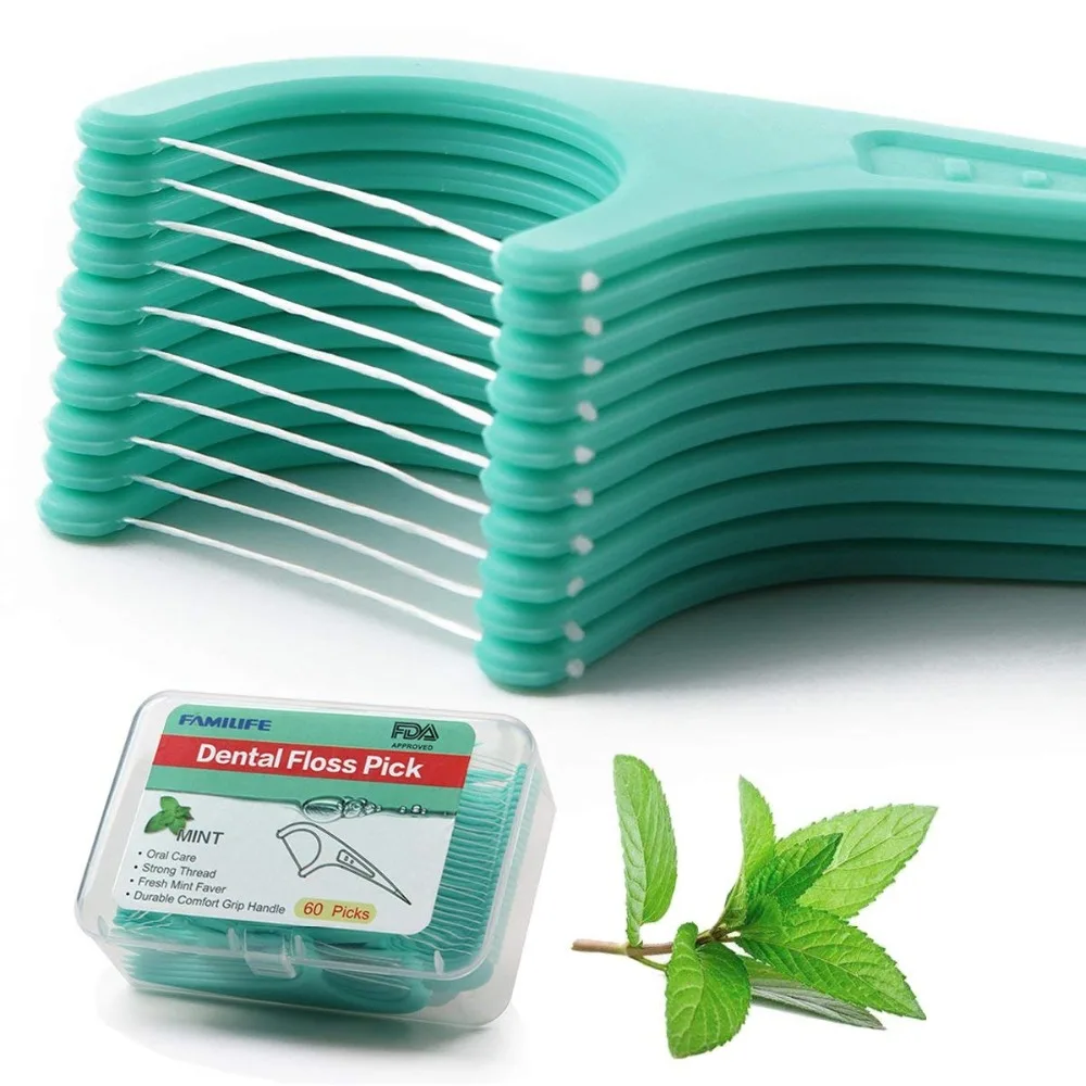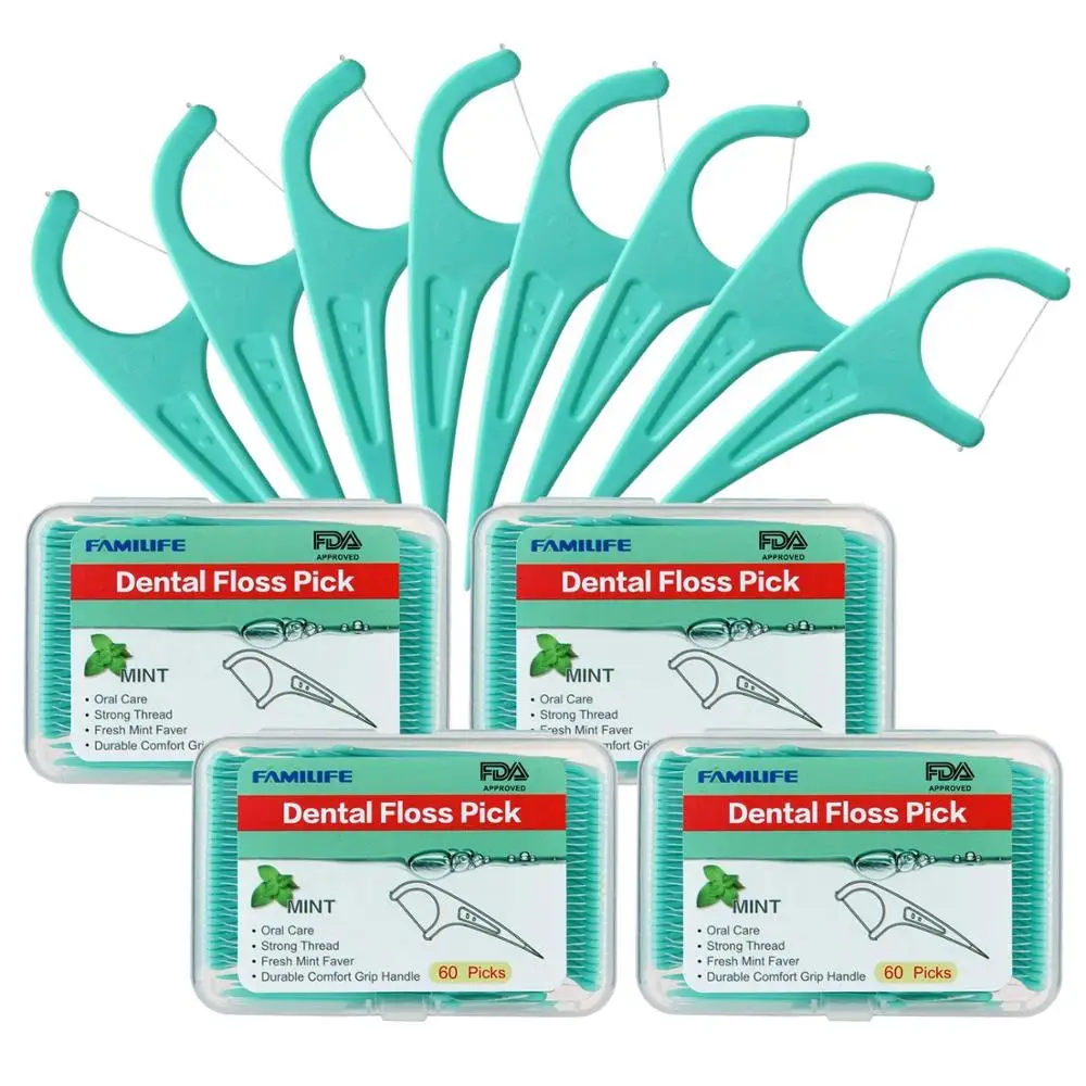 FAMILIFE невощеная зубная нить выбирает мяту (4 ящика, по 60 выбирает каждый. Всего 240 мягких пиков)
