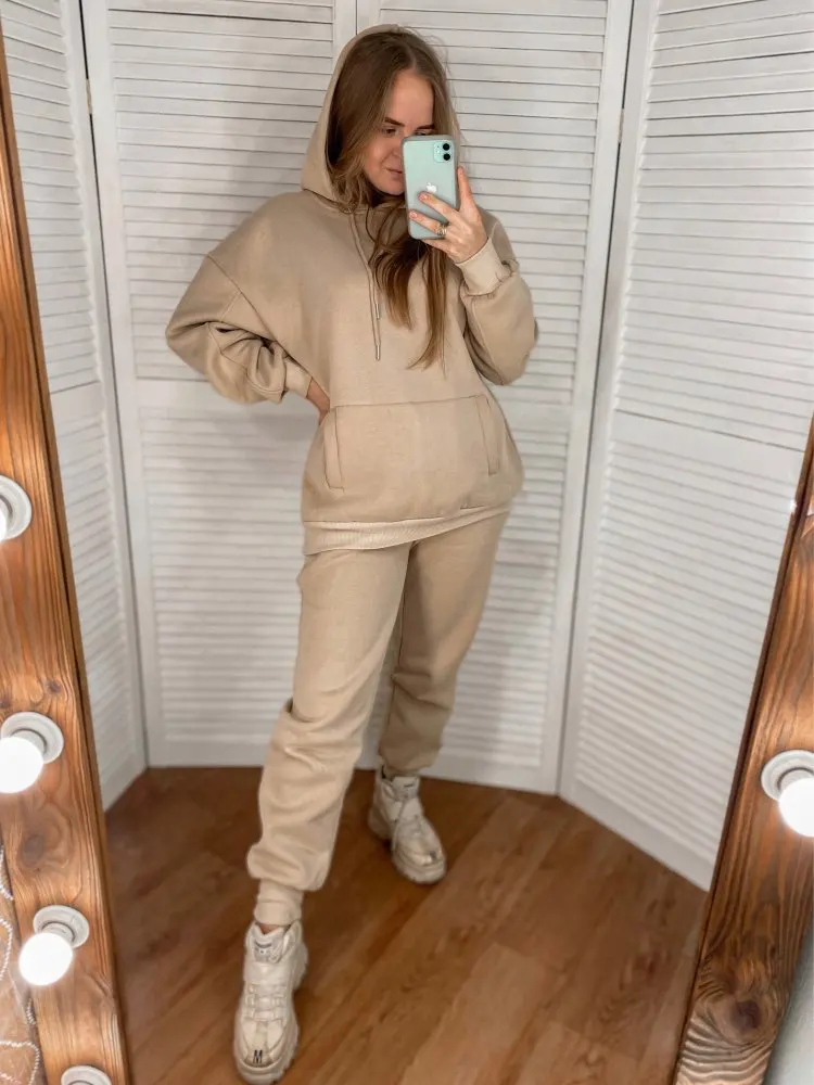 Отличный костюм. Мягкий, уютный, тёплый, хорошо сшит, выглядит очень достойно. На русский 46 взяла взяла М, получился легкий оверсайз. Штаны точно меньше не нужны, а то будут обтягивать попу/бёдра, а вот толстовку S я бы примерила. Но и так отлично!