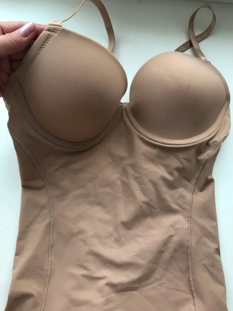 Прочитав отзывы,что еле влезает,заказала на размер больше,а зря(((Чашки жёсткие,без пуш ап,грудь смотрится отлично!Синтетика везде. В моём случае,длинным оказался торс. Попа без швов,что радует,для облегающей юбки или платья +!!! по своим деньгам,отличная покупка!!!Рекомендую!