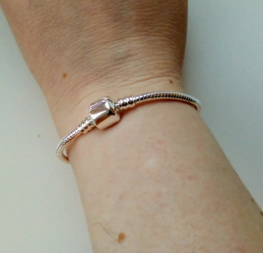 Как-то я не сообразила при заказе, что надо брать на пару см больше, чтобы можно было добавить шармы. Но можно и так носить, смотрится очень нежно. Главное, что это практически копия браслеты Пандора. Только нет названия на замке браслета.