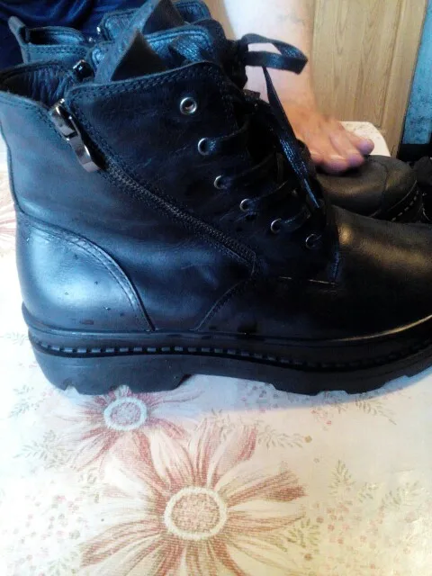 Доставка быстрая, всего 2 недели в Сибирь. Продавцу спасибо! Кожа натуральная, как на картинке. Замки очень туго работают, но это мелочи. Подошва проклеена, следов клея нет. Сама подошва г.. Будут застревать мелкие камешки. Как- то странно изогнута к центру, не анатомично. Колодка тоже вовнутрь косит. Вес посылки 1570 гр. Как байкерская обувь пойдёт, как рабочая сильно сомневаюсь. Размер подошёл, длина стельки 30.2 см. Муж сказал больше обувь ему в Китае не покупать.