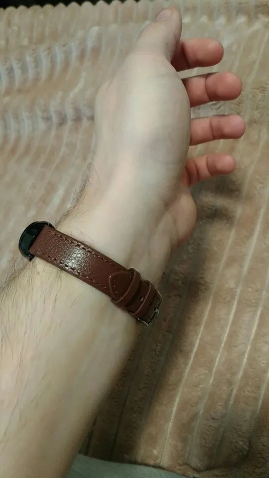 ремешок выглядит просто шикарно. есть сомнения насчет долговечности кожзама. Ремешок стараюсь не мочить на всякий случай. но браслет с ним сидит очень удобно, даже спать особо не мешает. если я не ошибаюсь, то ремешок шириной 13мм можно заменить в случае чего на обычный от женских часов. в целом, мне очень понравился, рекомендую. доставка и отправка были молниеносными