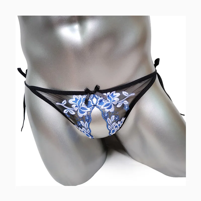 Роскошные стринги с цветочной вышивкой для мужчин, сексуальное нижнее белье Sissy, прозрачные кружевные сетчатые трусы для геев, открытая промежность
