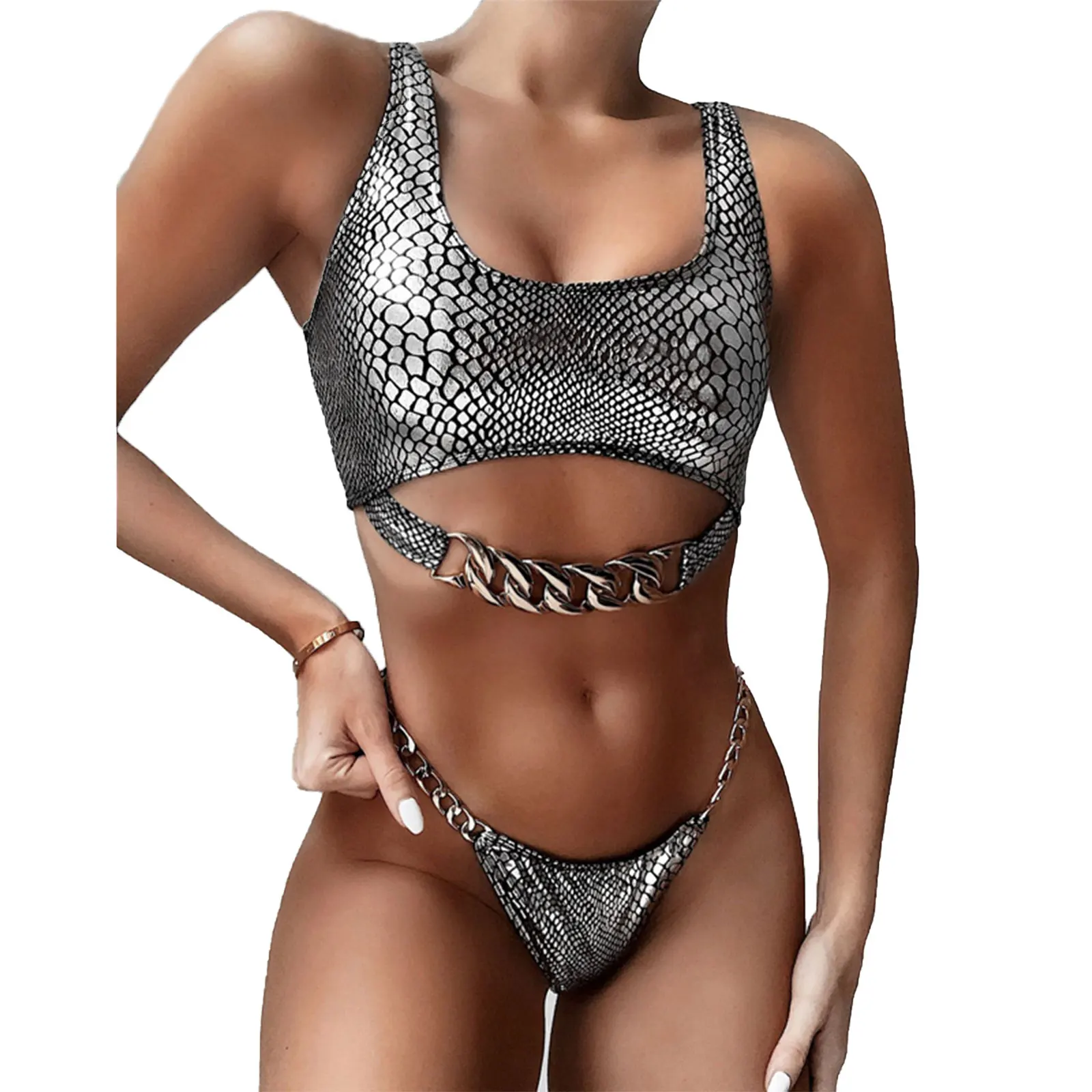 Женский купальник с принтом змеиной кожи, комплект бикини с металлическими цепочками, топ с треугольными Низами