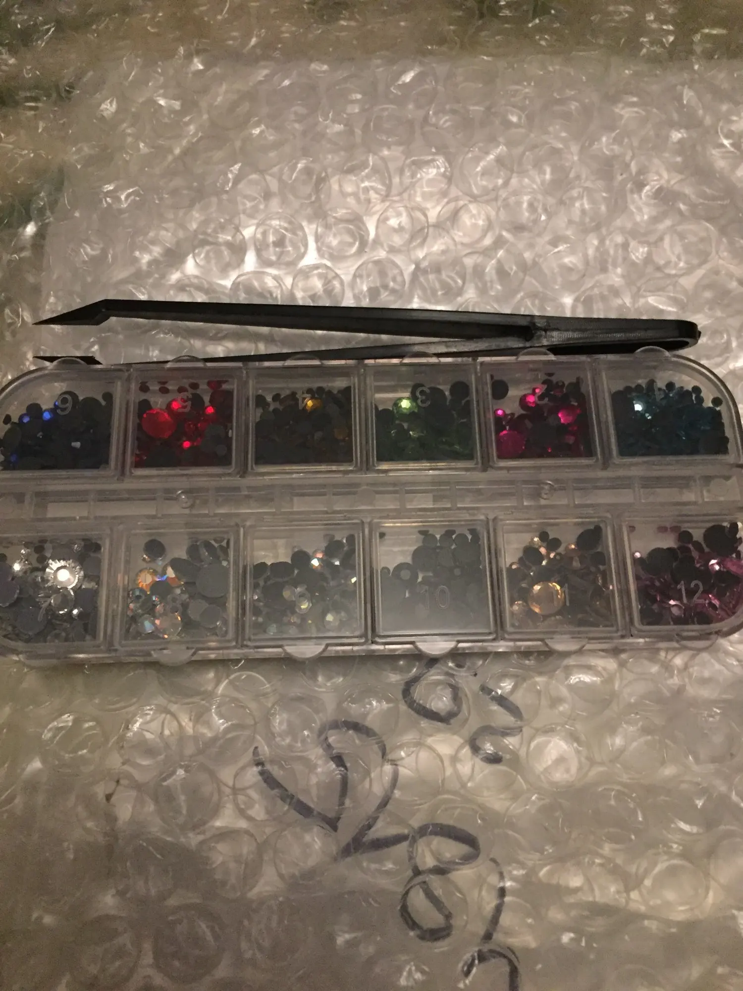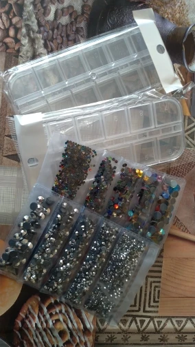 Стразы пришли в Москву за 3 недели. сейчас приходят товары в одном пакете( несколько заказов в одном). На фото каждый размер страз лежит в своей ячейке, у меня смешались. Получается нужно сортировать.Много синих оттенков