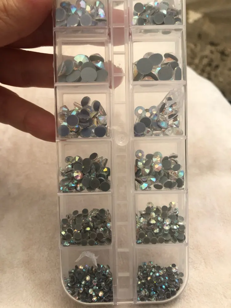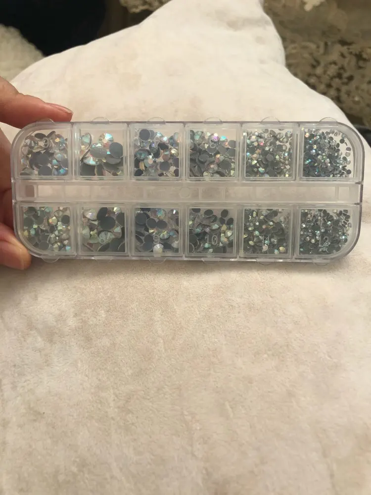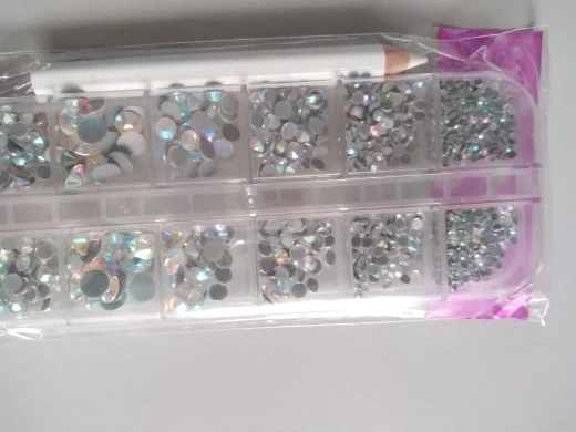 Он прибыл в течение 20 дней, соответствует описанию, это кристалл, у меня есть только две проблемы, одна из которых большая часть, они гигантские, я узнаю, как я их использую, В комплекте две вещи с серой основой, которая выглядит как одежда на глажке, я хотел их для ногтей, Но я все еще буду использовать их, я рекомендую.
