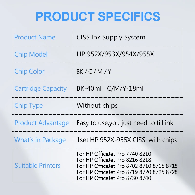 Название продукта: СНПЧ, система непрерывной подачи чернилМодель чипа:Для HP 952 / 953 / 954 / 955Для HP 952X / 953X / 954X / 955X(Это универсальные чипы)Цвет чипа: BK / C / M / YЕмкость картриджа: BK-40ML / C M Y-18MLТип чипа: без чипов, без чиповПреимущество: удобно использовать, вам просто нужно заполнить чернилаГарантия: в случае обнаружения дефекта замена 1:1