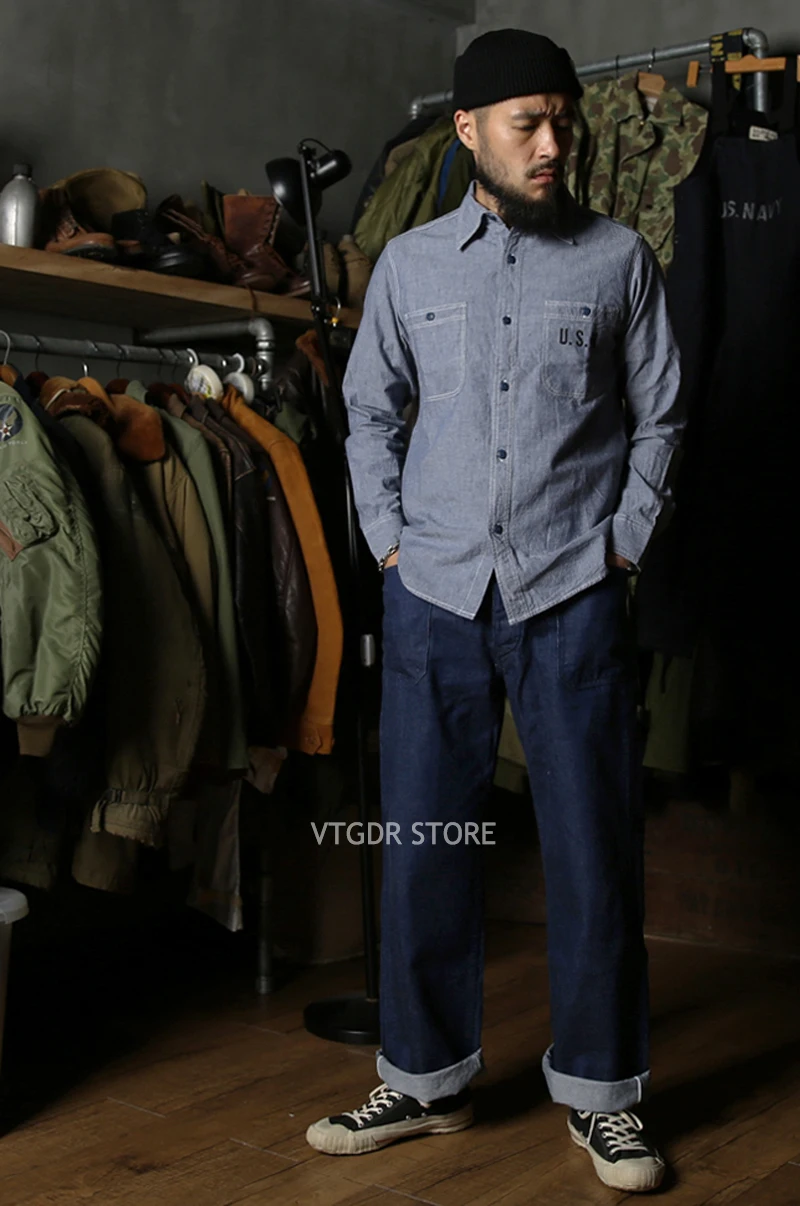 Бронсон WW2 USN Chambray Рабочие Рубашки мужские винтажные штанишки военно-морская Спецодежда