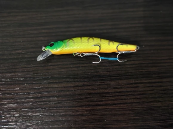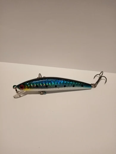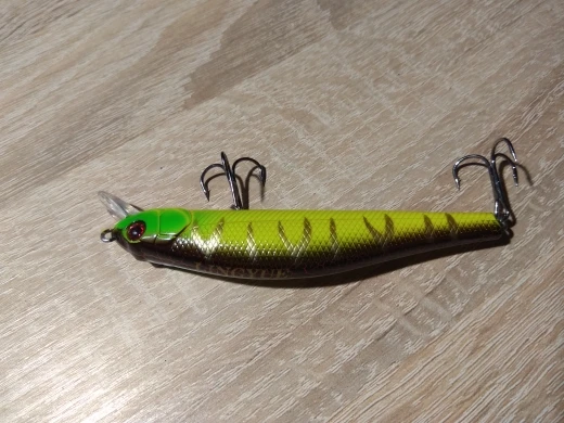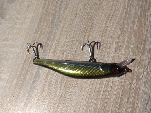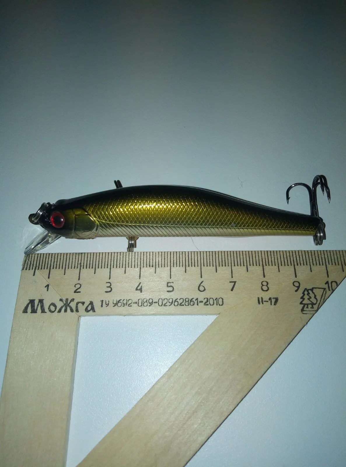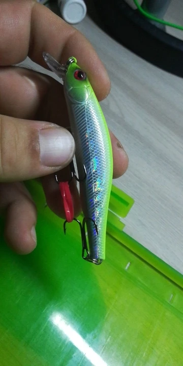 Красивая приманка, в интересном цвете. С боков и брюшка в натуральной расцветке, а спинка в ярком зелёном цвете, что очень удобно для контроля за проводкой воблера сверху. Крючки и колечки конкретно у этого экземпляра средненькие, на четвёрочку с натяжкой. Петли надо клеить. Плавающий. СДЗ-магнитка, достаточно сильная. Вообще копию этой модели риджиков, сложно найти на Али, ну и цена на неё относительно высока. Рекомендую. 144,49 ₽.