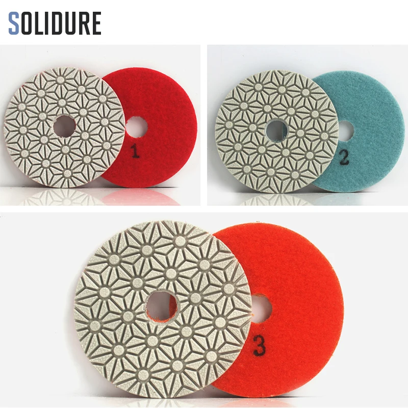 4 дюйма 100 мм алмаз влажные 3 шаг полирующие коврики комплект из босоножек ручной станок подходит используется для сухой полировки гранита, марльбе, engineeried камень и т. д. Мы рекомендуем 4500 об/мин получить лучший результат полировки.