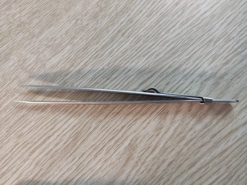 Удобный пинцет, хорошо сидит в руке, концы смыкаются плотно, не изгибаются самопроизвольно, скользящий замок расположен удачно под пальцем.