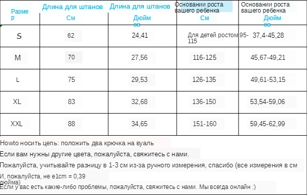 Размер XXL: Длина брюк: 88 см/34,65 дюйма, для детей от 151 до 160 см/59,45-62,99 дюйма.