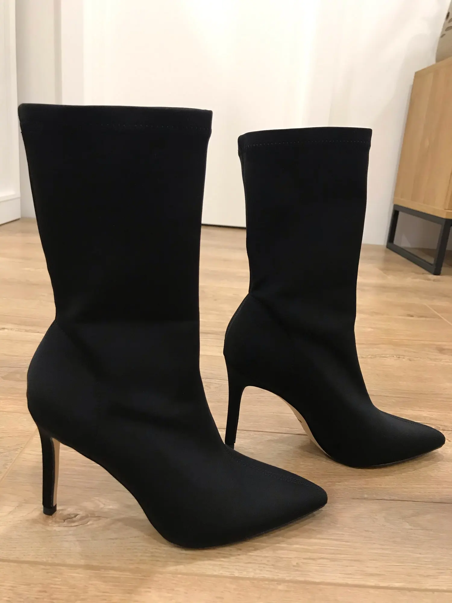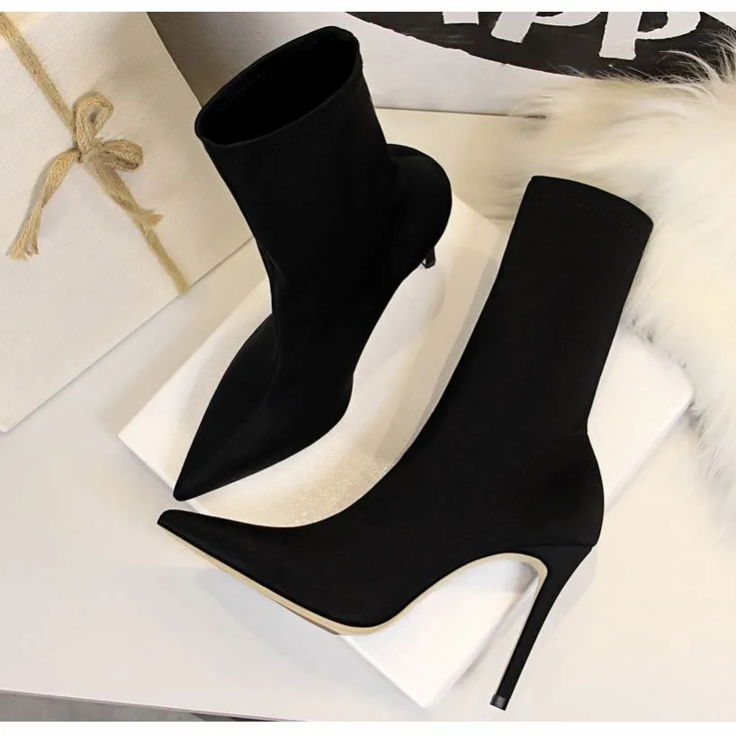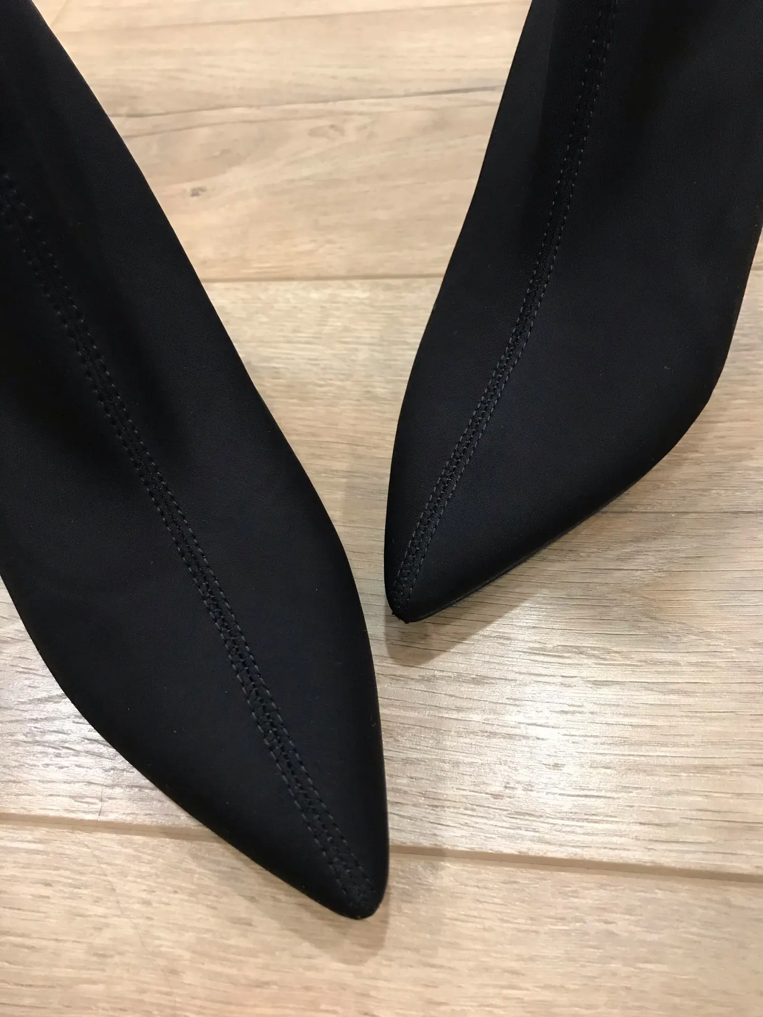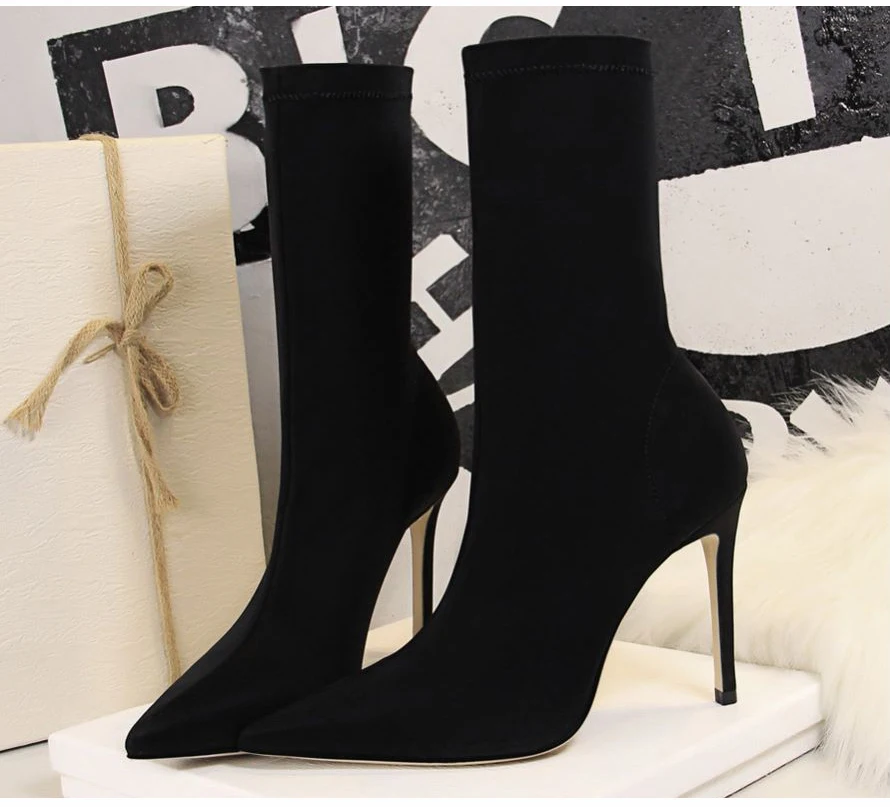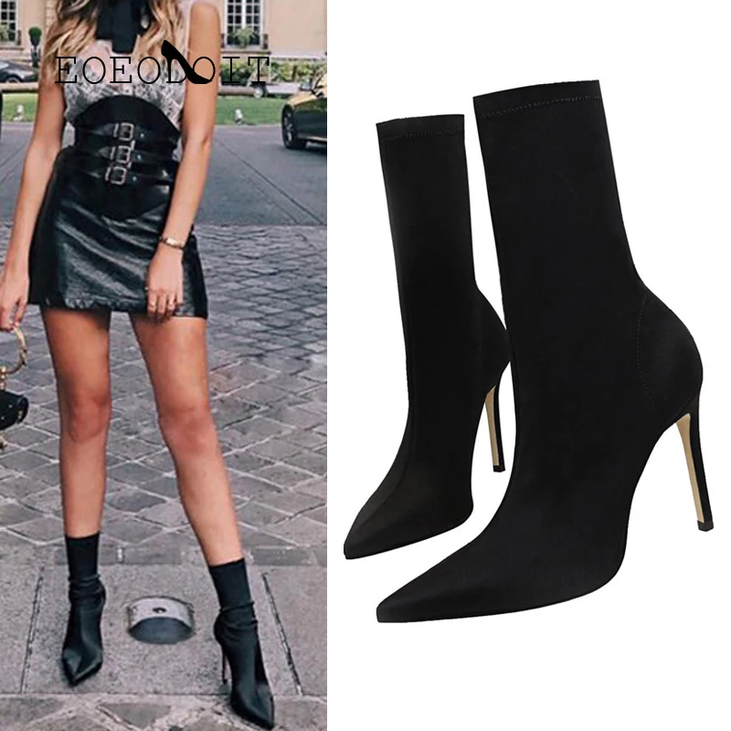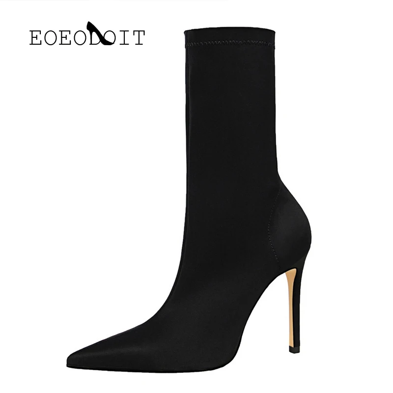 Женские сапоги-чулки EOEODOIT, из лайкры, с острым носком, высокие каблуки-шпильки, размера плюс см, 9,5 см