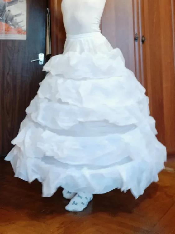 Кринолин супер! быстрая доставка (меньше двух недель), на поясе липучка и завязки. Удобный, лёгкий, но при этом объемный, швы в порядке. На мой рост (178см) длина ниже середины икры, на девушек поменьше будет вообще в пол. Сейчас немного отвисится и будет вообще здорово. Позднее постараюсь дополнить отзыв фотографией с платьем.