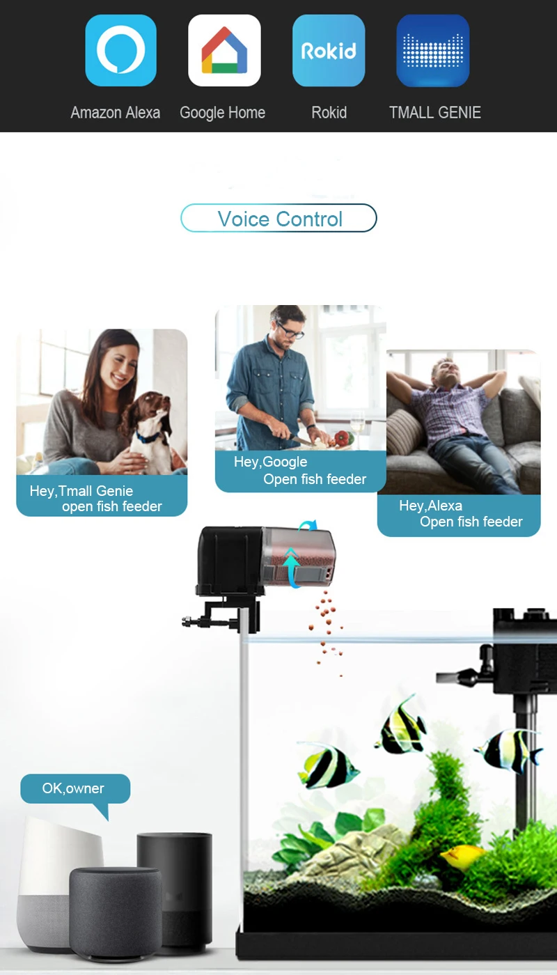 Название продукта:Автоматический аквариум для рыб кормушка для еды ГРМ/Wifi Беспроводной интеллектуальный пульт дистанционного управления диспенсер для аквариумаФидер версии Wifi:Материал: пластикЦвет: черный/розовое золото/сереброТолщина зажим для крепления: ≥ 3,5 смРежим питания: источник питания microUSBПотребляемая мощность в режиме ожидания: 135 МВтМногоступенчатый регулируемый объем подачи: Диаметр гранул <7 ммДлина Подачи Листа и ленты <15 ммСилос большой емкости: емкость для хранения 165 мл-175 мл, около 140 г-160 гРабочая среда: 0 ~ 40 °C, влажность <80%Размер изделия: 13,5*6,5*5,5 см/5,3*2,56*2,16 дюймовДва способа установки: фиксированный зажим и двухсторонняя наклейка на липучке на выбор Особенности:1. Пульт дистанционного управления: через мобильный телефон APP, 2,4 GHz Wifi управления, вы можете управлять питателем в любое время и в любом месте, и вы можете проверить записи кормления.2. Голосовое управление, легко управлять питателем, выдавая голосовые команды. Поддержка более 16 языков, подходит для системы IOS и системы Andriod,3. Функция умной памяти, когда сеть закрыта, она все равно будет распределять питание в соответствии с предыдущими настройками.4. Интеллектуальная связь: несколько устройств работают вместе в облаке5. Простая эксплуатация и установка: различные методы подачи, поддержка дистанционного питания Wi-Fi, ручное, автоматическое и вращение на 360 градусов6. Функция синхронизации и обратного отсчета: гибкая настройка времени, вы можете сделать автоматический график подачи,7. Регулируемый порт подачи: вы можете отрегулировать порт подачи на фидере рыбы в соответствии с реальной ситуацией. Подходит для различных питательных мощностей.8. Сохранить рыбную еду свежей: влагостойкая Воронка может держать еду свежей и держать большинство видов пищи, включая хлопья, гранулы или крошки.Нет фидера версии Wifi:Характеристика:Материал: пластикЦвет: черныйНе поддерживает приложение, не Голосовое управлениеРазмер порта подачи регулируется, подходит для различных каналовПоддержка функции ручной подачи.Питание от аккумулятора 2 * AA (не входит в комплект)Упаковка включает в себя:1 * Автоматический фидер для рыбы1 * USB кабель для передачи данных1 * Винтовой кронштейн1 *Двухсторонняя наклейка на липучке1 * Руководство пользователя (на английском языке)