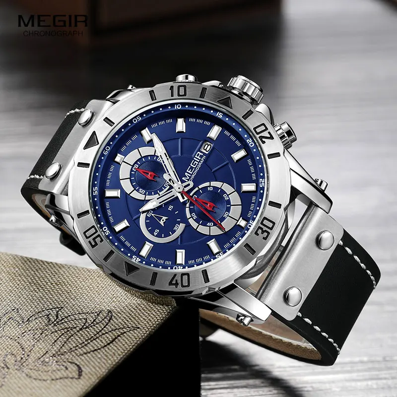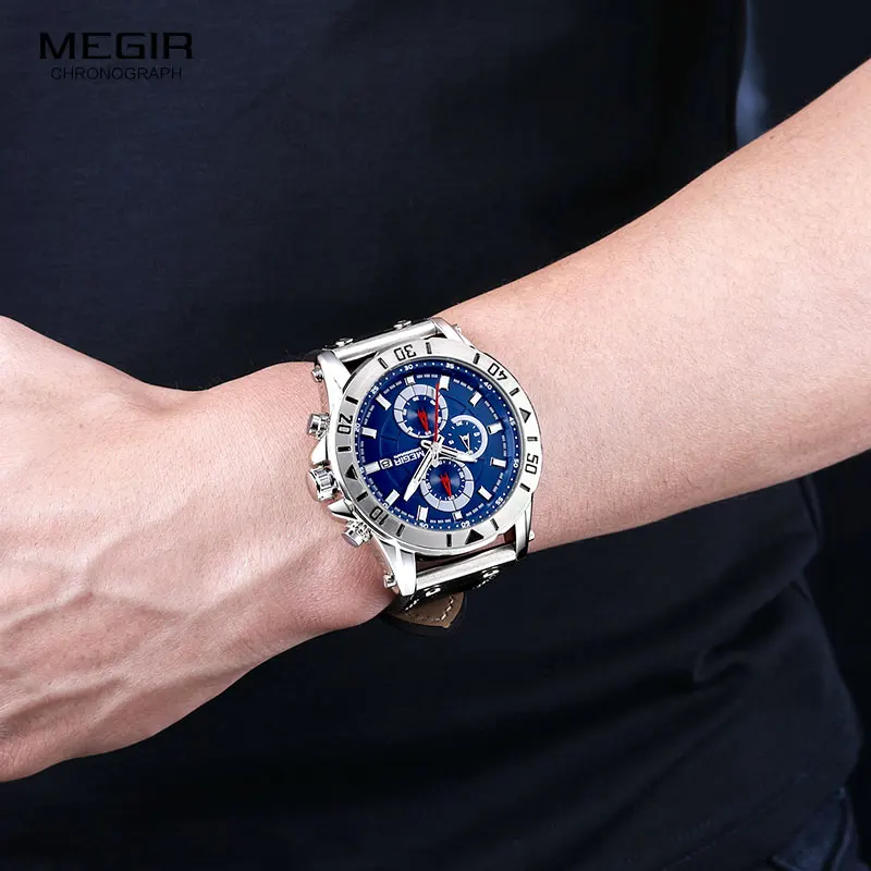 Часы наручные Megir Мужские кварцевые с хронографом, спортивные армейские, Водонепроницаемые Синие, с кожаным ремешком, 2081