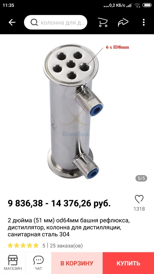 2 " (51 мм) OD64mm SS304 конденсатор 200 мм, 6 труб внутри, ID8mm 1 шт