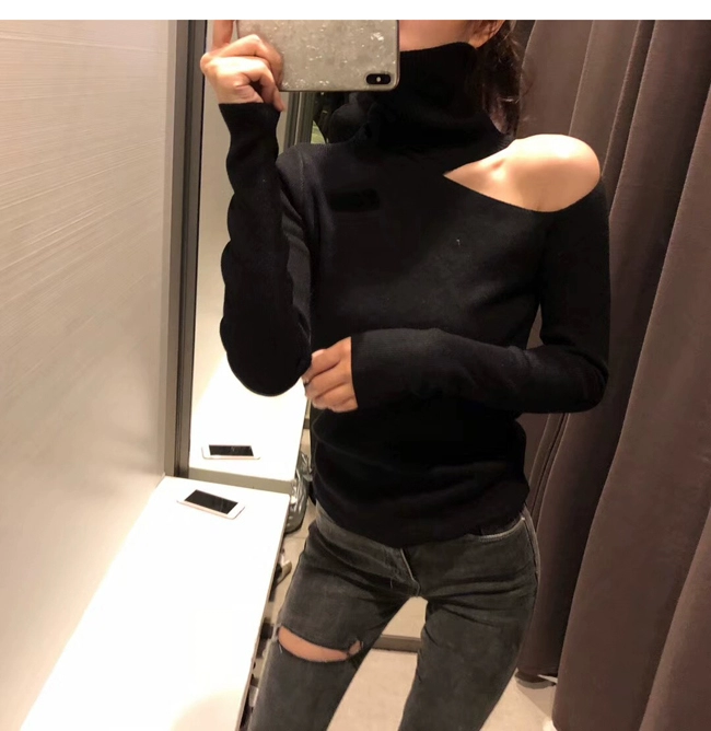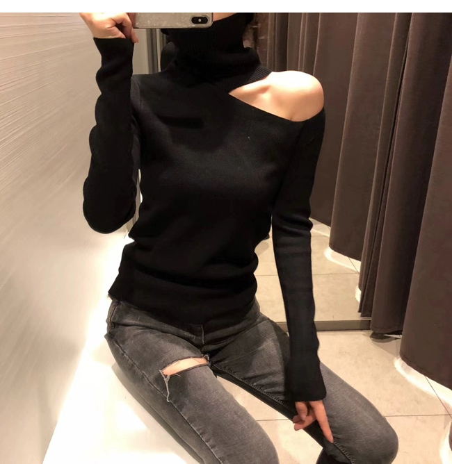 Трикотажный свитер женский с длинным рукавом, высоким воротом и открытым плечом