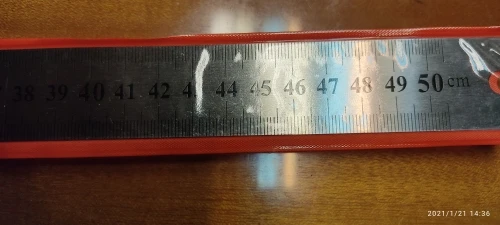 Отличная линейка! Отправлена и доставлена быстро. Упаковка порадовала. Было запаковано в несколько слоёв. Пришла идеально ровной. Спасибо продавцу! Потёртостей краски нет. С одной стороны сантиметры, с оборотной дюймы. Толщиной около миллиметра, ощущается надёжно.