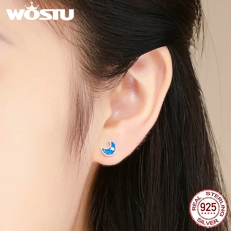 Женские сережки-гвоздики WOSTU из настоящего серебра 925 пробы с блестящей Луной и планетой, ювелирные украшения для вечеринок, серебряные сережки FME151