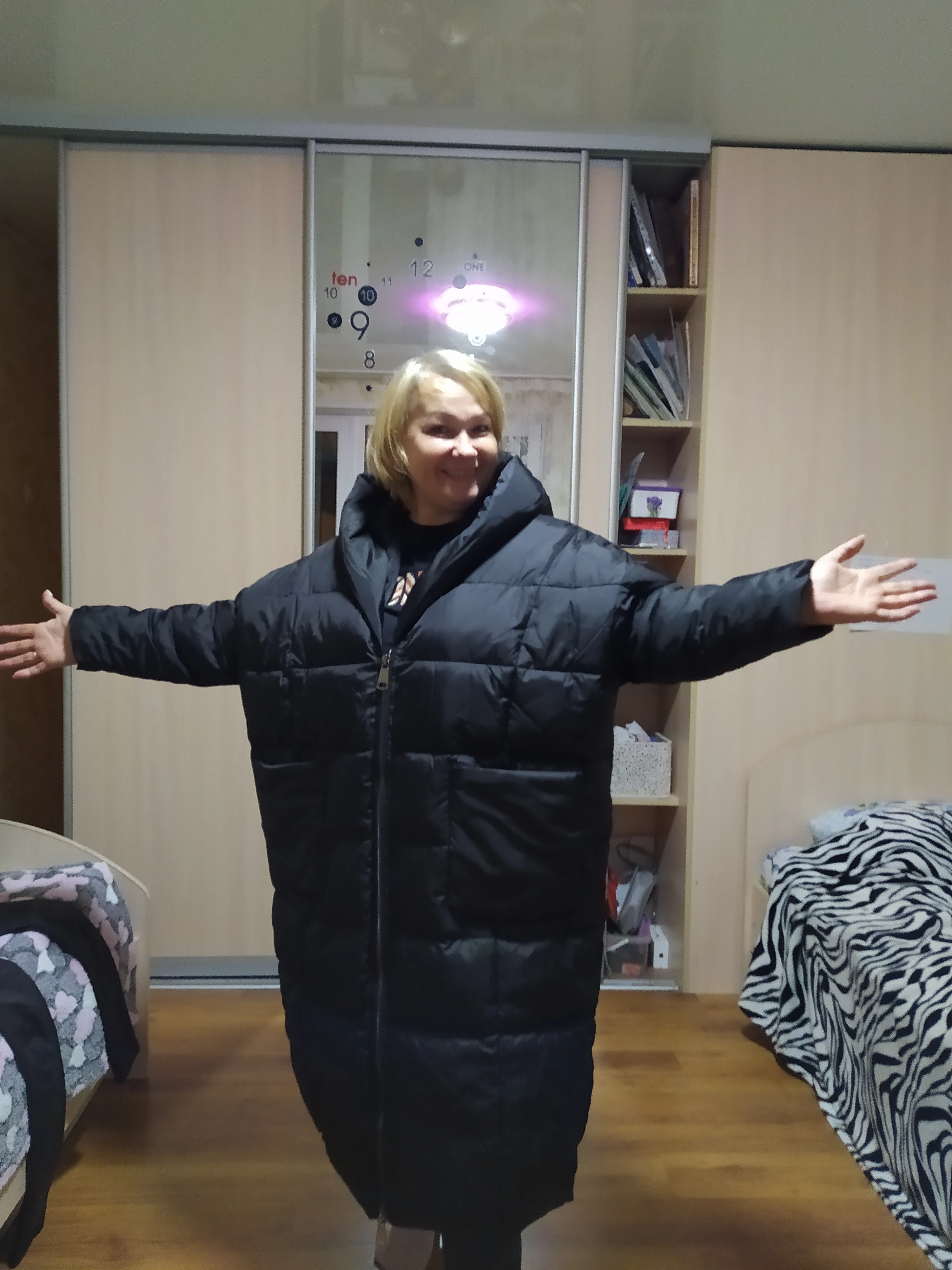 Огромное спасибо, пальто отличное! Несмотря на приближающиеся праздники, доставка в Москву чуть больше двух недель. Отличный оверсайз, вниз можно надевать что угодно))))) достаточно длинное. На 44-46 отлично сидит!