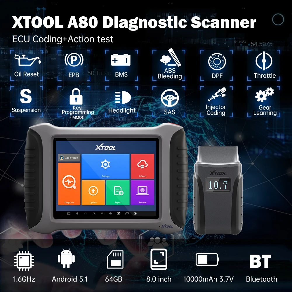 XTOOL A80 автомобильный диагностический сканер с улучшенным кодированием ECU, позволяет повторно мигать скрытую функцию, чтобы настроить транспортное средство по мере необходимости без необходимости платить за оптимизацию конкретных характеристик транспортных средств. Кроме того, это позволяет обновить координацию ECUs, повторно флэш-модули управления транспортными средствами, перекодировать адаптивность для некоторых компонентов после ремонта или замены и т. Д.