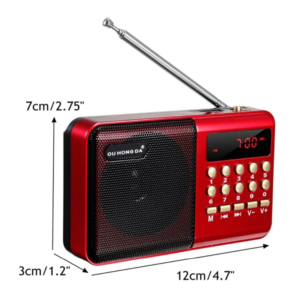Посылка включает в себя:1 х портативное радиоАккумулятор 18650-1 шт.1 х USB кабель для зарядкиСпецификация:Цвет: красныйВыходная мощность: 3 ВтTHD: ≤ 5%Динамик: 57 мм 3ΩFreq. Ответ: 240 Гц-15 кГцFM частота: 70 МГц-108 МГцВходная мощность: 5 В постоянного тока 0.5AБатарея: 18650 3,7 V/1200mAHОсобенности:-Очень громкий, несмотря на небольшой размер.-Воспроизведение до 8000 песен в формате MP3.-Простота в использовании.-Питание: слайд для включения или выключения.-Режим: Нажмите, чтобы изменить источник между MP3(USB/SD) и FM. В режиме FM нажмите и удерживайте для автоматического поиска и настройки частоты станции.-Предыдущая: в режиме MP3 нажмите, чтобы перейти к предыдущему треку, нажмите и удерживайте, чтобы быстро вернуть трек. В режиме FM нажмите, чтобы выбрать предыдущую предустановленную станцию.-Далее: в режиме MP3 нажмите, чтобы перейти к следующей дорожке, нажмите и удерживайте, чтобы быстро передвинуть дорожку. В режиме FM нажмите, чтобы выбрать следующую предустановленную станцию.-Vol. Вниз: Нажмите, чтобы уменьшить громкость.-Vol. Вверх: Нажмите, чтобы увеличить громкость.-Номер 0-9: в режиме MP3 нажмите, чтобы выбрать определенную дорожку, которую вы хотите слушать (например, нажмите 28, чтобы выбрать 28-ю дорожку в вашем списке воспроизведения). В режиме FM нажмите, чтобы войти в станцию, которую вы хотите слушать (e.g. Нажмите 898, чтобы выбрать станцию вещания 89,8 МГц).-Usb-порт: вставьте usb-накопитель для воспроизведения музыкальной дорожки.-Наушники: Вставьте наушники, если вы не хотите беспокоить других при прослушивании.-Слот TF: вставьте флэш-накопитель microSD (TFcard) для воспроизведения музыкальной дорожки.-5 в постоянного тока: Подключите кабель питания (USB-mini USB) для зарядки аккумулятора.