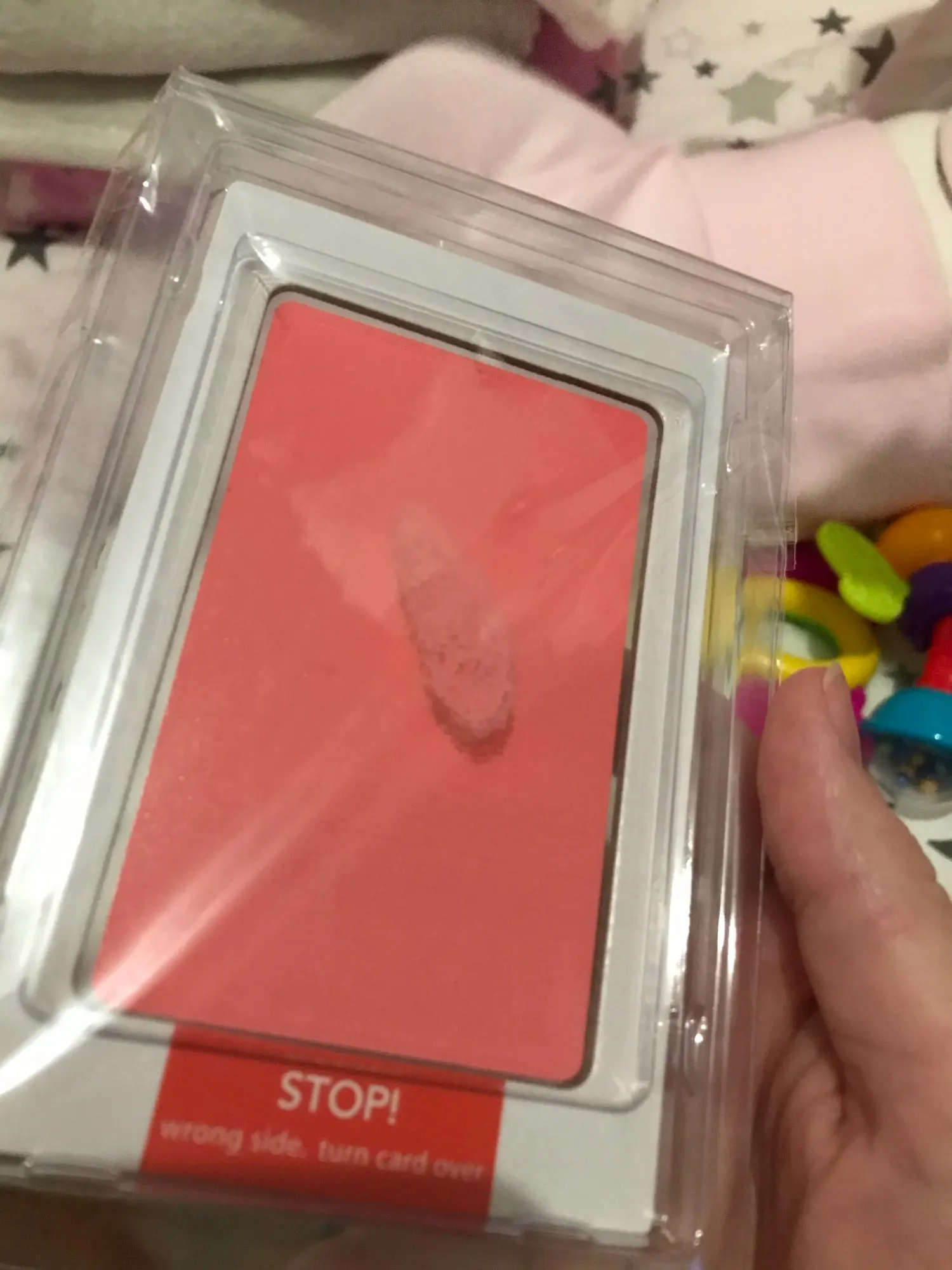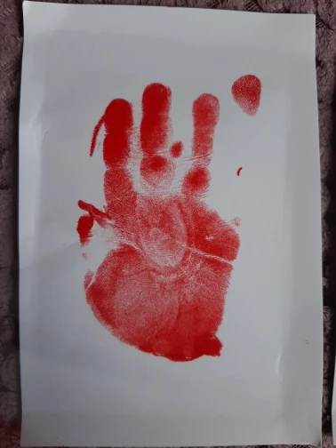 Прийшло з відбитком пальця, але скоріше за все це не вина продавця, тому зірки не знімаю. Там де був відбиток, пальцем розвела фарбу рівномірно і все получилось акуратно. Товаром задоволена. Вийшла ручка, ніжка, і ще два відбитка. Нам 5 місяців, ручка і ніжка впритик помістилась.