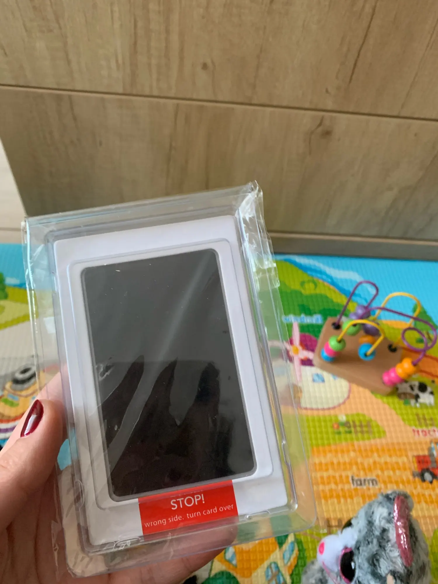 Пришёл в срок на укрпочту, хотя первый раз забирала на новой. Набор без повреждений, в упаковке. Заказала второй потому, что первый подарили. Набор рассчитан на 2 отпечатка, не более!!!. Краска без проблем смылась мылом. Переживала, что на 7 месяцев будет мало, но все ок. Фото результата прилагаю