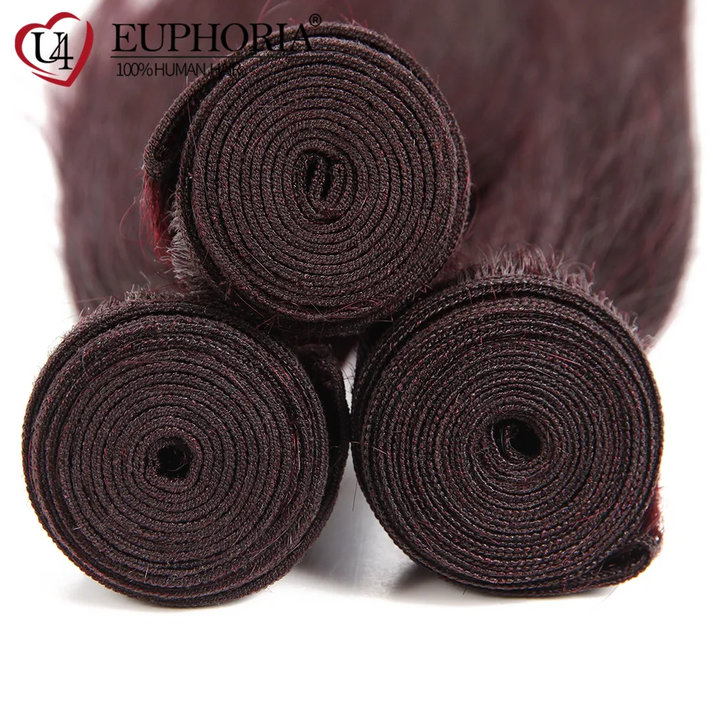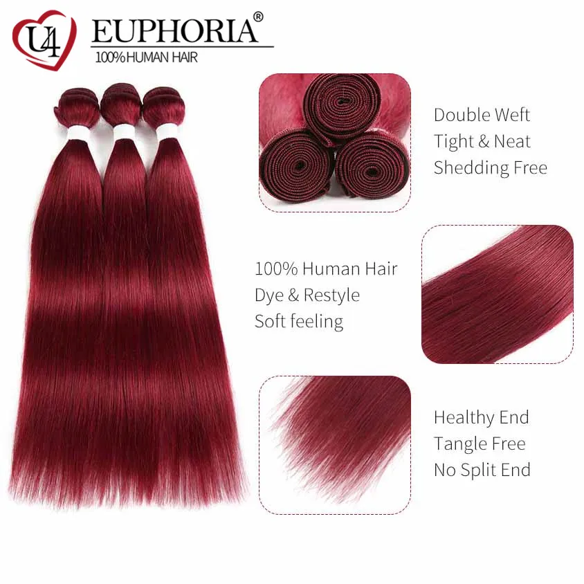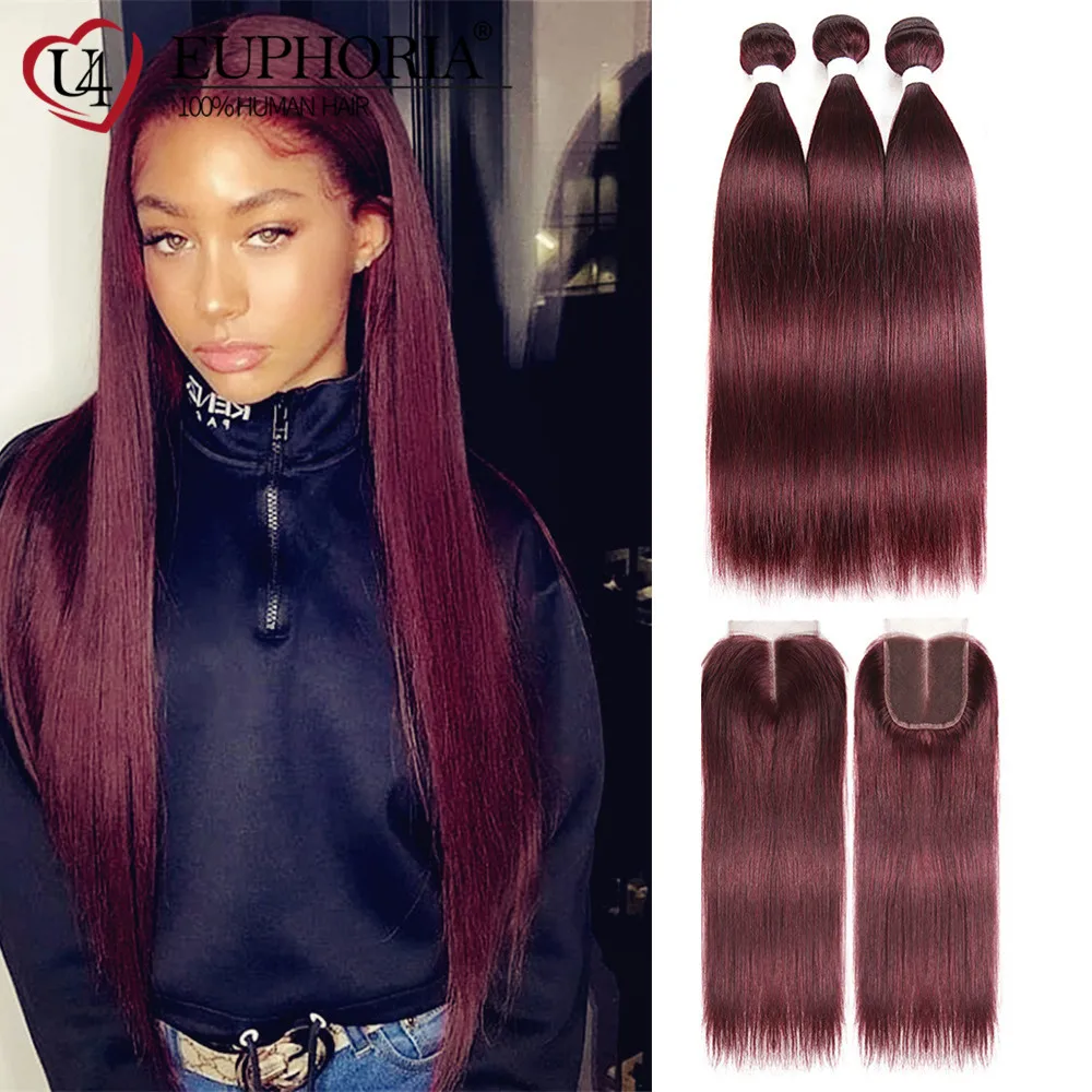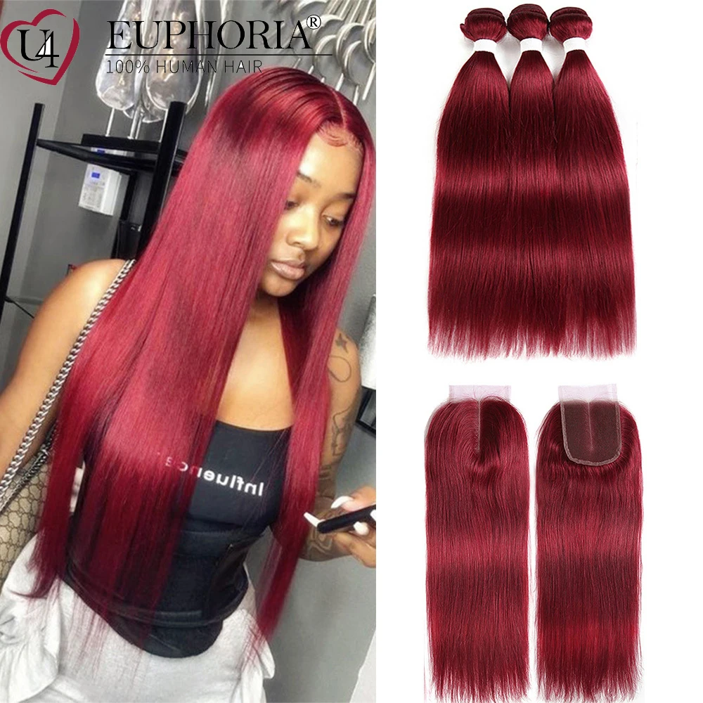 Прямые пряди волос с фронтальным кружевом 13x4 красный бордовый 99J бразильские Remy человеческие волосы 3 пряди с кружевной застежкой 4x4 Euphoria