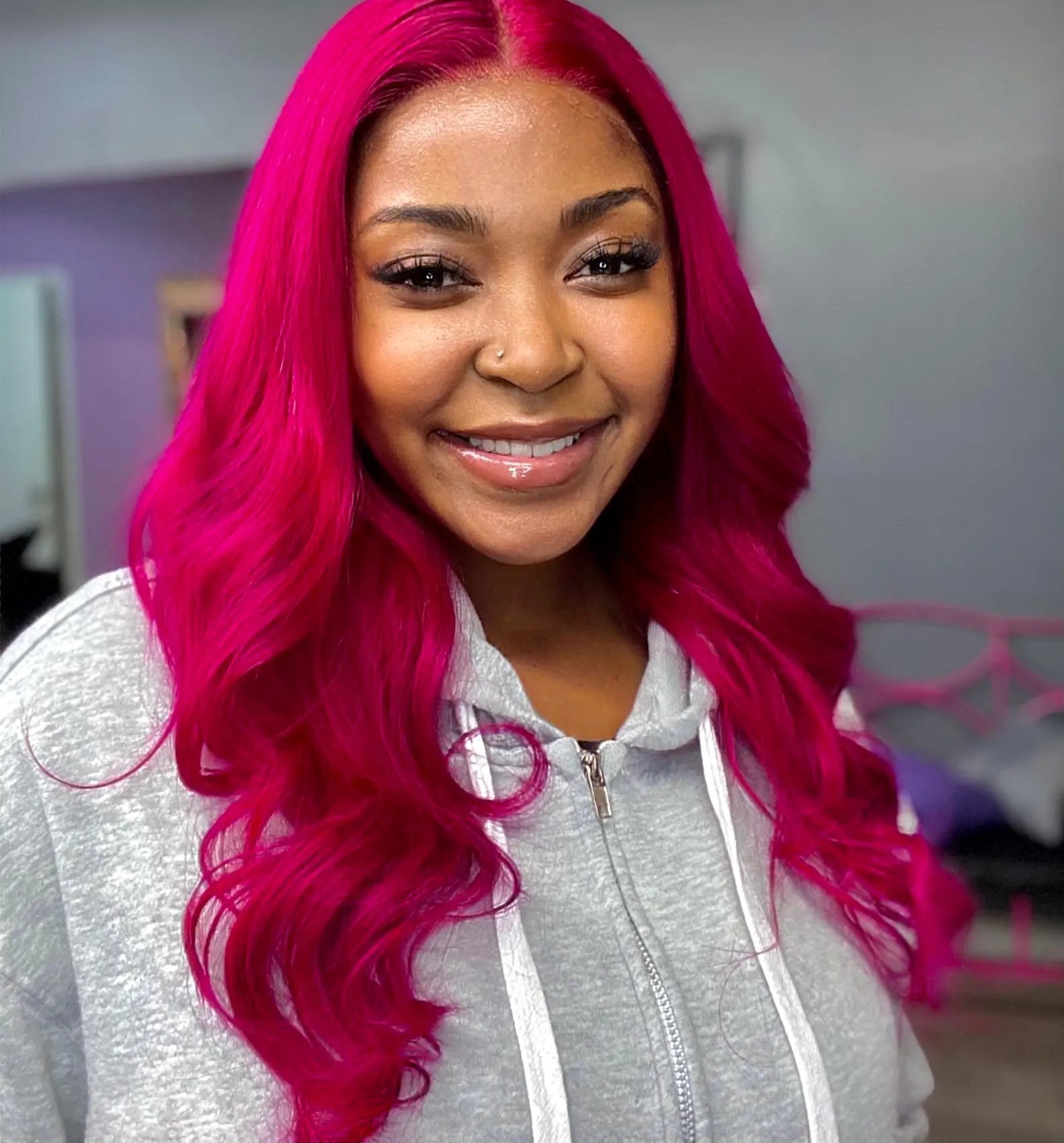 Доставка была быстрой, и я люблю мои волосы, даже если не бордовый, а Розовый Фуксия, но мне все еще нравится... я думаю, что мне нравится этот цвет лучше, чем бордовый, теперь я получил 22 дюйма С 18-дюймовым фронтальным обязательно закажите снова