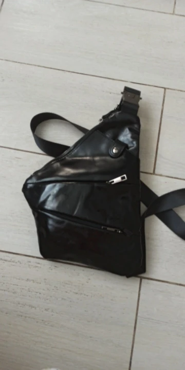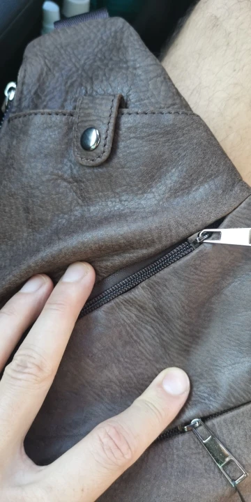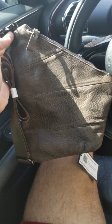 Это, конечно, не кожа совсем, и пахнет не кожей. Но сумка удобная, не очень большая: удобно висит под левой подмышкой (можно даже на спину закинуть или на живот); не очень маленькая: помещаются ключи, кошелек, всякая мелочь, есть большое отделение для чего-то крупноформатного, и отдельное место для телефона - очень удобно. Сшита хорошо, молнии удобные.