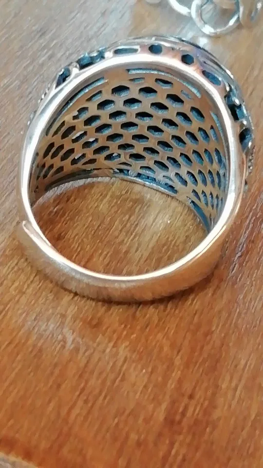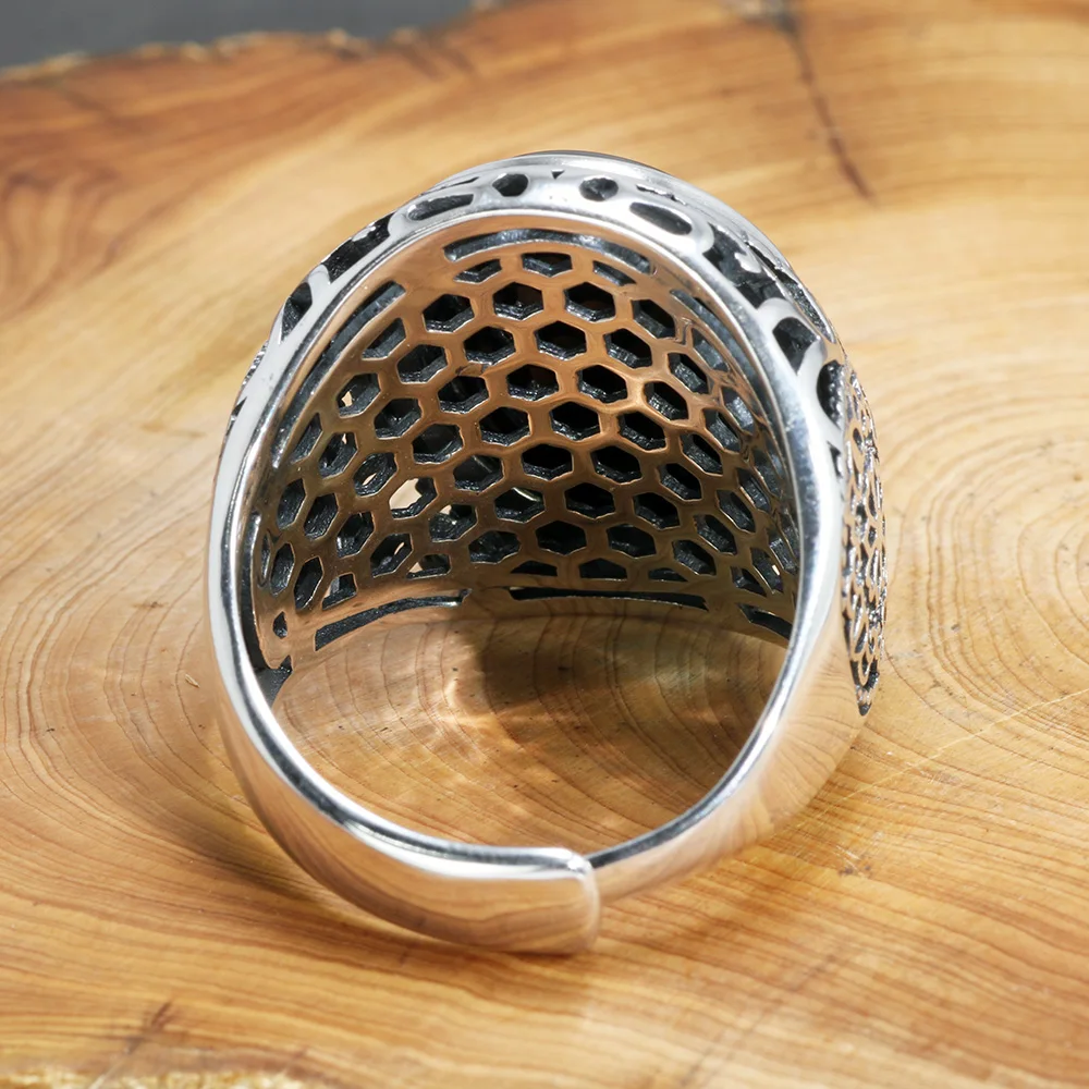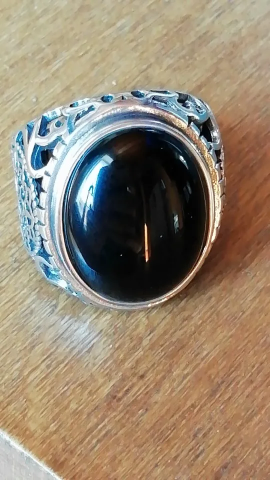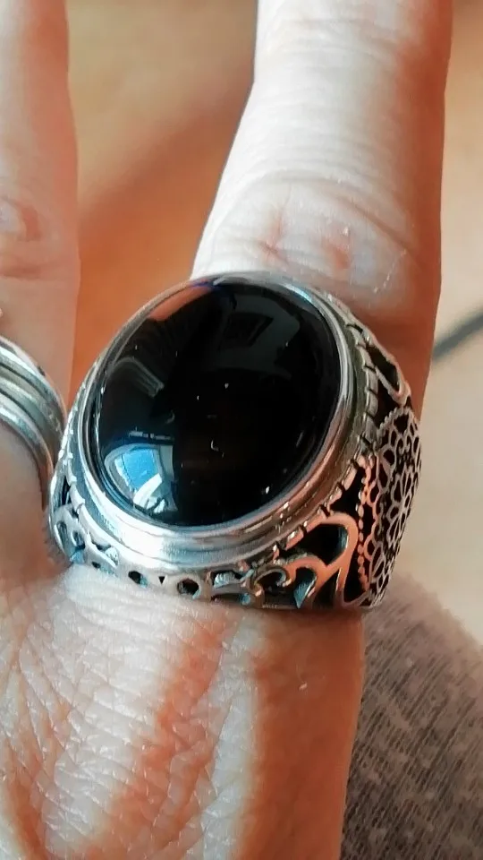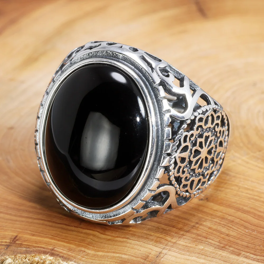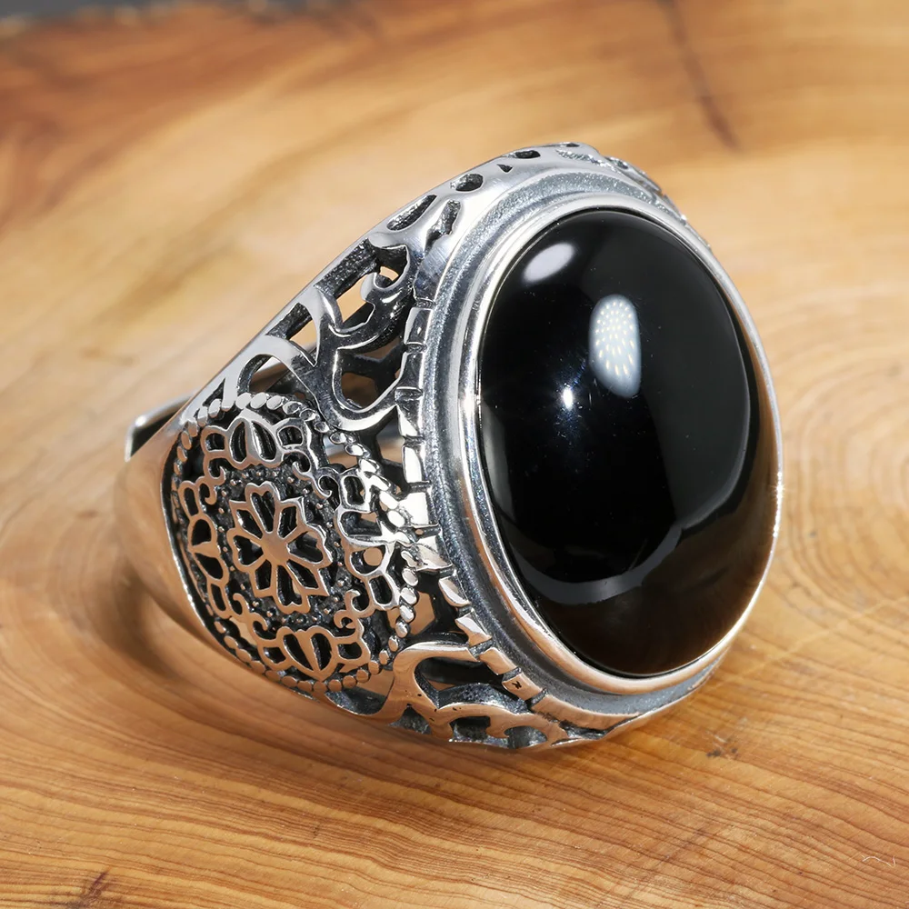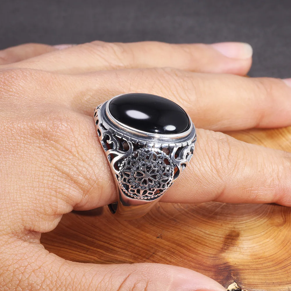 Мужское Винтажное кольцо с полыми цветами, открытое серебристое черное кольцо с реальным 925 пробы, большие натуральный камень оникс овальной формы, Ювелирное Украшение