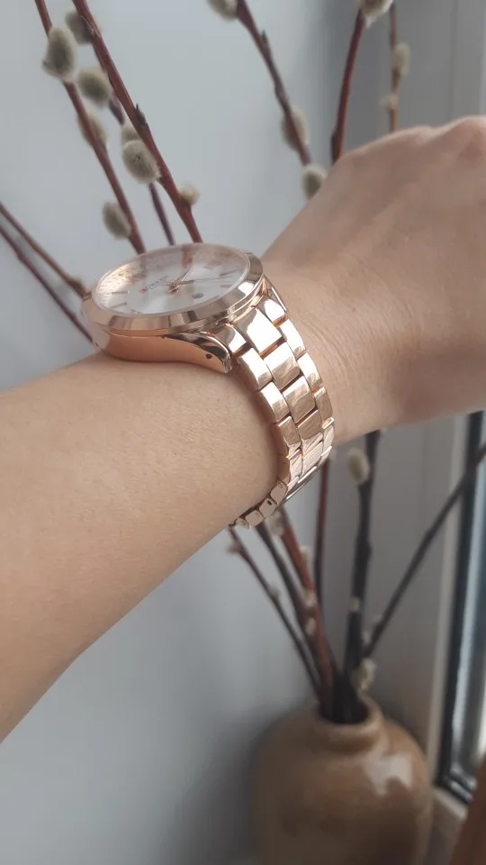 Часы замечательные! Смотрятся дорого, многие обращают внимание и спрашивают где купила. В меру тяжёлые, мне это нравится, без лишнего декора, для любителей минимализма.Это уже вторые такие часы, на первых в районе ремешка после года носки начало сходить покрытие с внутренней стороны у меня началась аллергия на металл(т.к я брызнула в то место духами, пошла реакция). Заказала для них кожанный белый ремешек и проблема решилась. Звенья легко убираются, что позволило уменьшить браслет на мое худое запястье. До Москвы дошли за 12 дней. Покупкой безумно довольна, однозначно рекомендую к покупке!