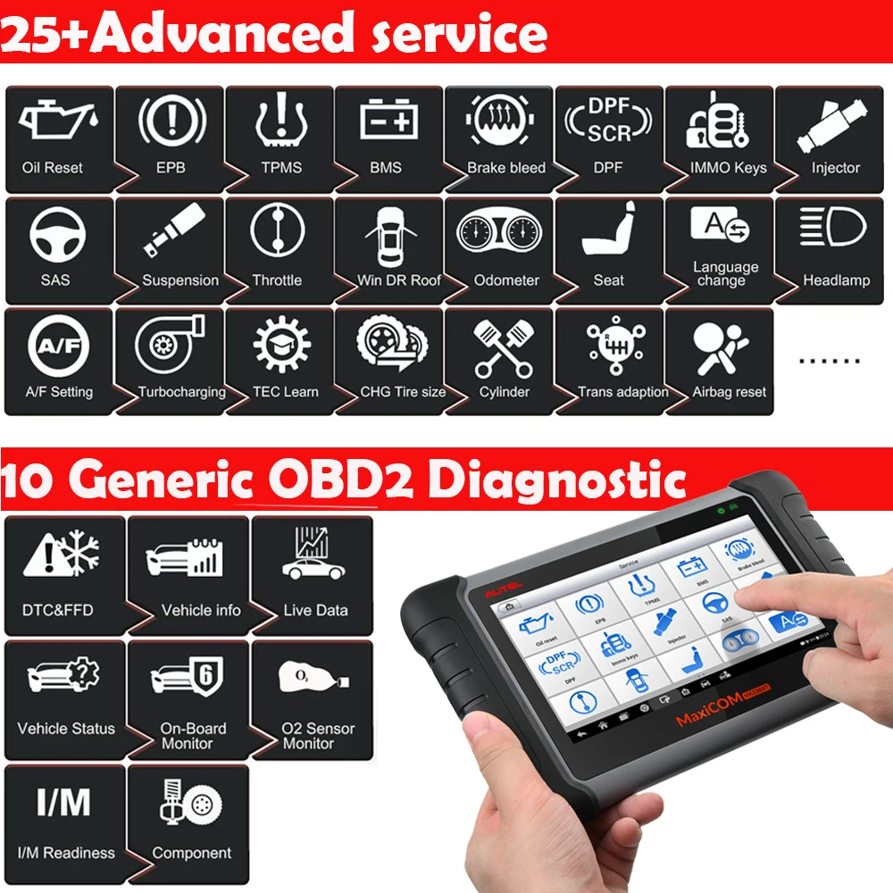 Благодаря мощной Cortex-A9 процессор, а также 7,0 дюймов ЖК-дисплей емкостный сенсорный экран, на базе Android многозадачность операционная система, И в сочетании с возможностью быстрого чтения и очистки DTCs для всех доступных модулей большинства марок и моделей на рынке, MaxiCOM MK808BT-это ваш идеальный инструмент для автоматической диагностики и обслуживания. MK808BT предоставляет вам превосходные специальные функции, включая сброс масла, EPB (электронный стояночный тормоз), SAS (датчик угла поворота руля), BMS (система управления батареей), И DPF (Дизельный сажевый фильтр).