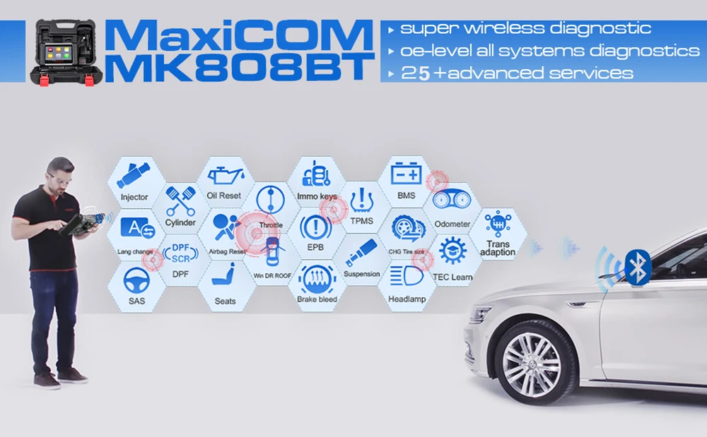 MK808BT автомобильный диагностический инструмент может выполнять 25 сервисных услуг, включая сброс масла, сброс EPB, сброс SAS, регенерацию DPF, регистрация батареи, сброс дроссельной заслонки, АБС-изгиб, Кодирование инжектора, ключ IMMO (добавить новые ключи, обучение клавишам, отключение потерянных ключей) и т. Д.