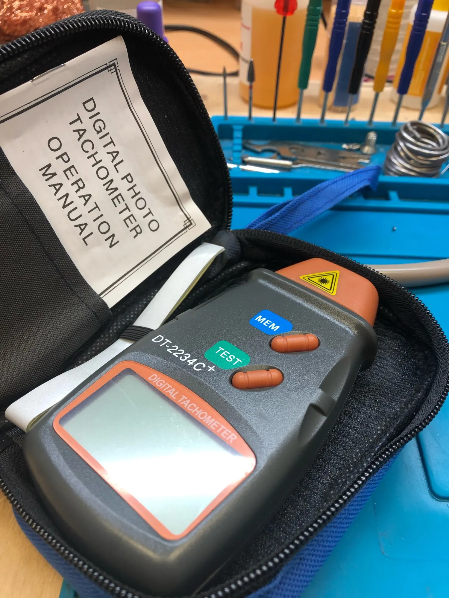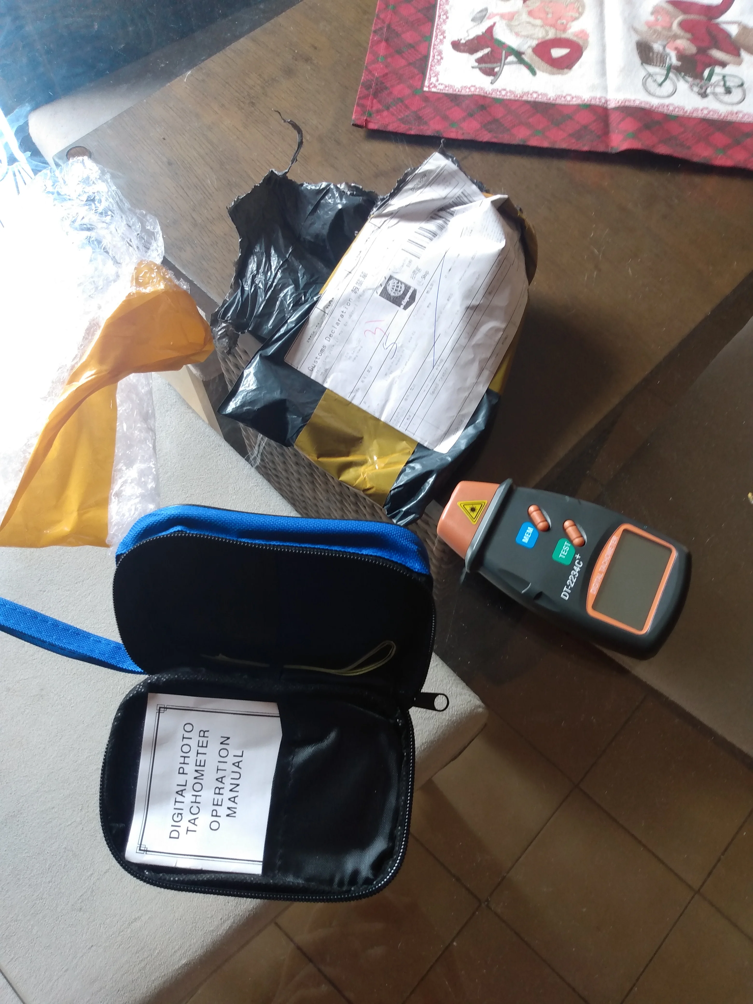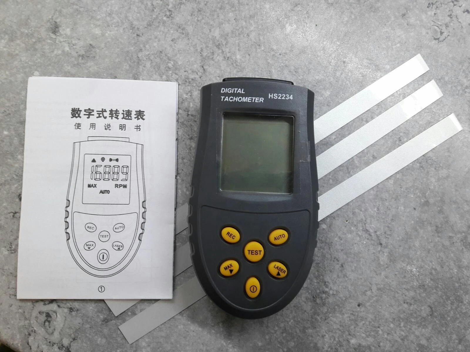 2 недели до Мск. Некоторые пишут, что неудобно пользоваться: цифры на экране вверх ногами. Они, действительно, вверх ногами. Но! Если удерживать кнопку измерения, прибор фиксирует последнее показание. То есть, алгоритм такой: поднес к вращающемуся предмету, нажал кнопку, повернул прибор к себе, посмотрел на показания, отпустил кнопку. Работает с куском белой бумаги вместо светроотражающих стикеров, которые идут в комплекте. Some people says it's inconvinient to use this tool due to the fact that LCD is set upside down. They do not know probably it holds the last measurement until one releases the measurement button. So the alghoritm would be: 1. Point the tool to your rotating object; 2. Push and hold the button; 3. Turn the LCD to your eyes; 4. Read the measurements; 5. Release the button. The nice thing is that it works with white paper pieces instead of the reflecting stripes provided.