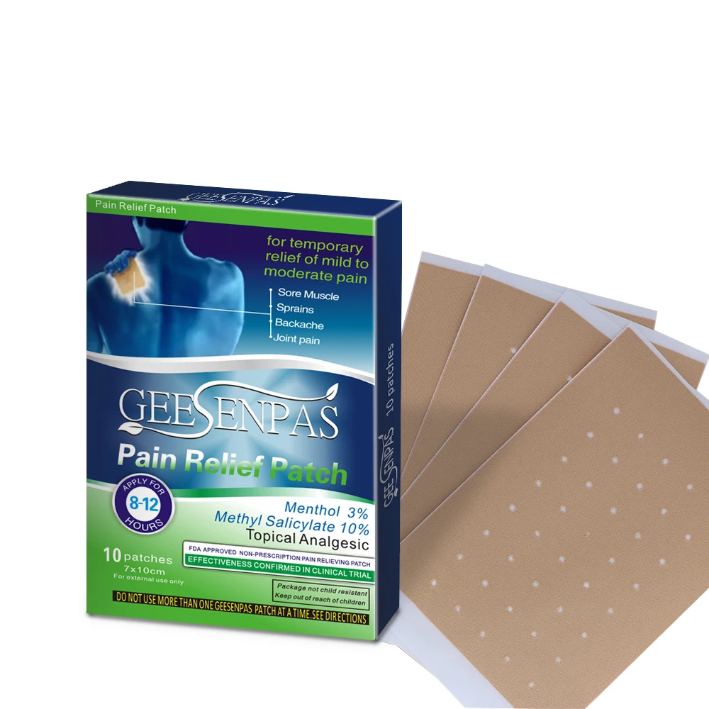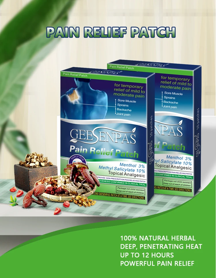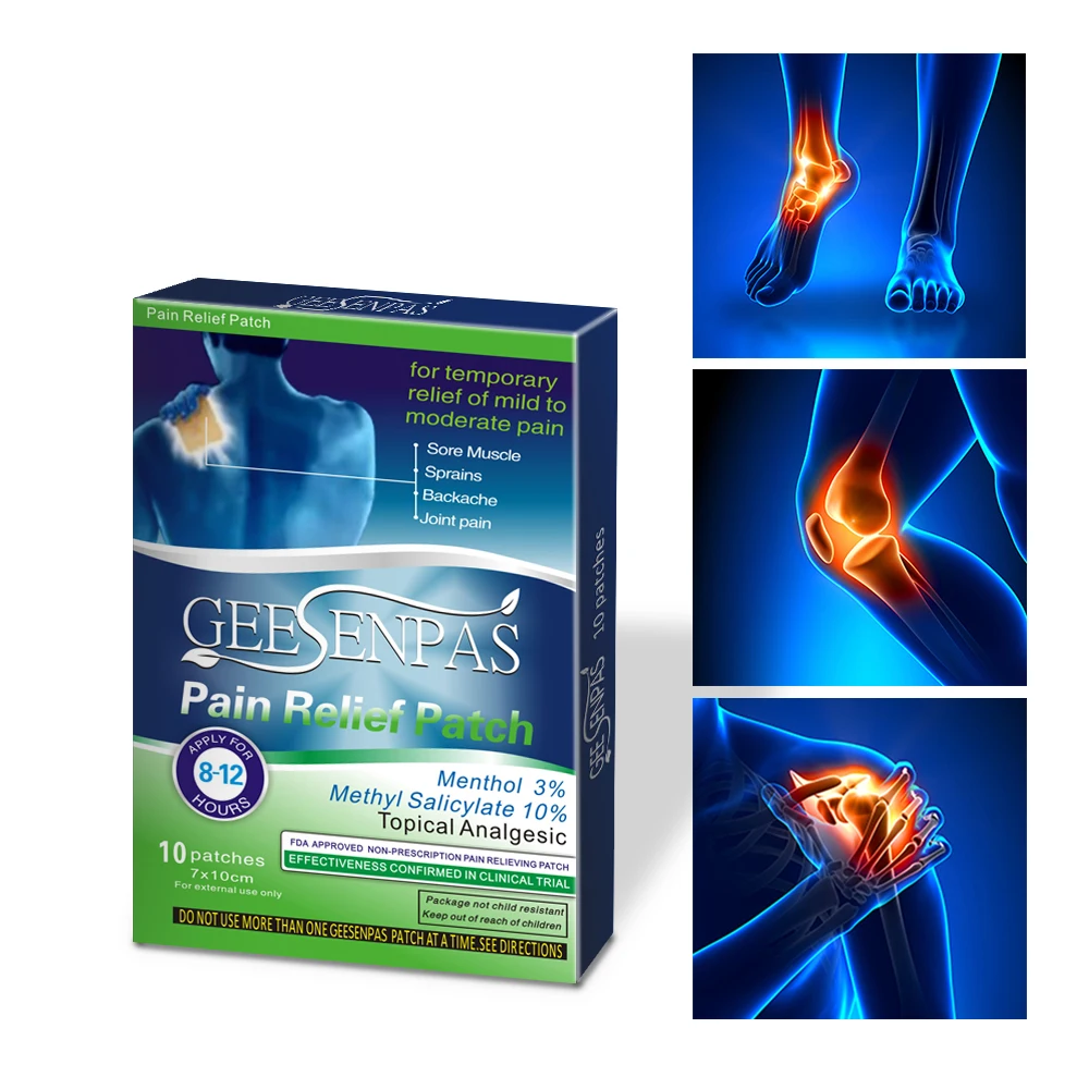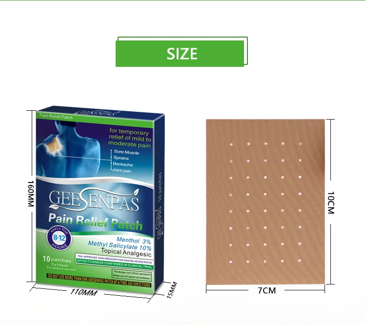 Упаковка: 10 пластырей в пакете, 1 пакет в коробке. Для облегчения боли и воспалений, связанных с: мышечной усталостью, мышечной болью, жесткой болью в плечах, растяжением артрита, ушибами, легким переломом обморожения. Болевые патчи