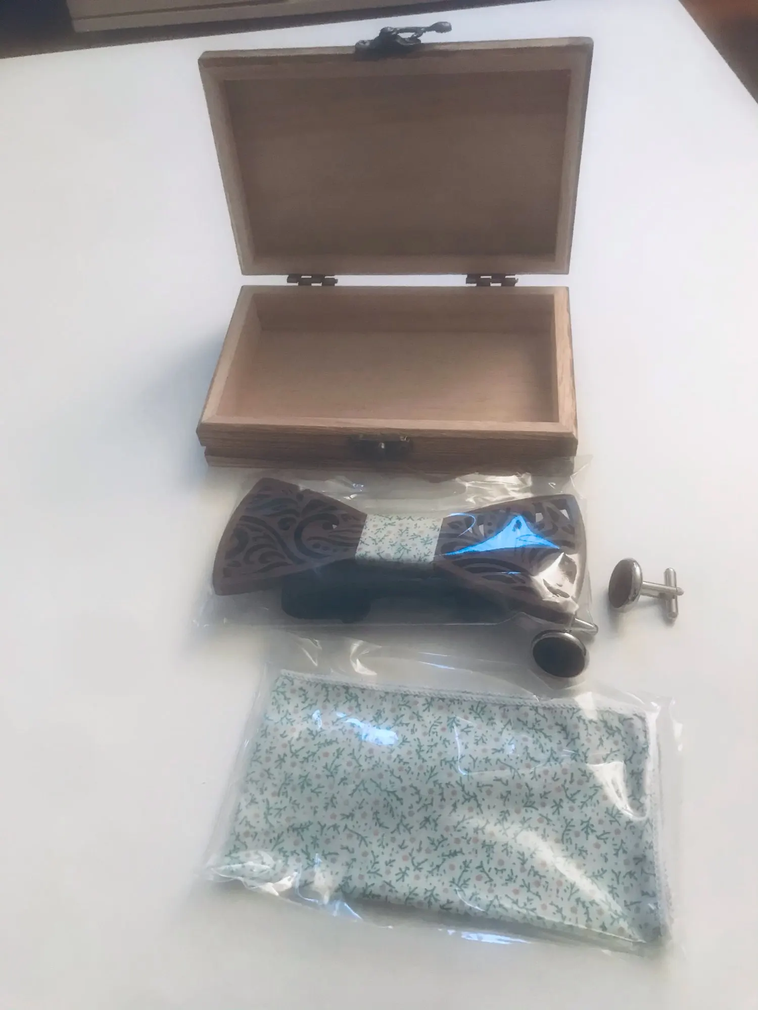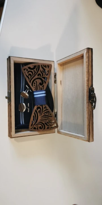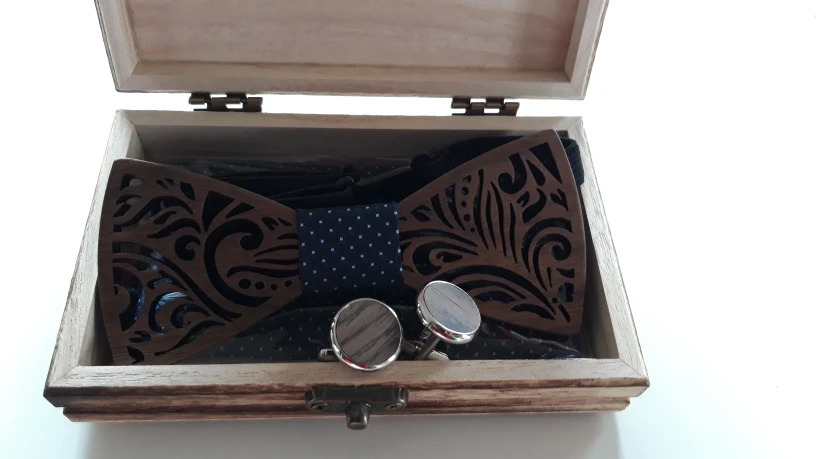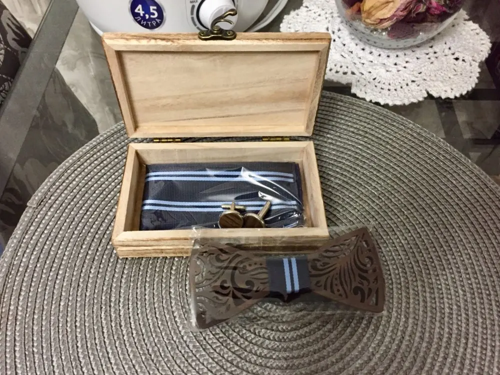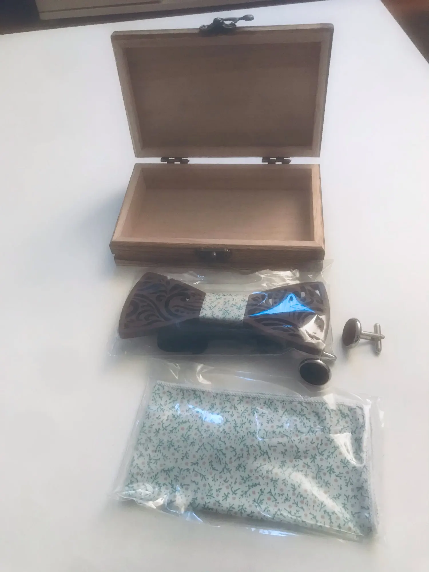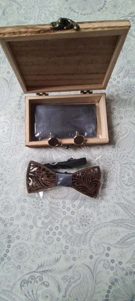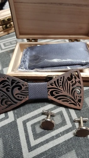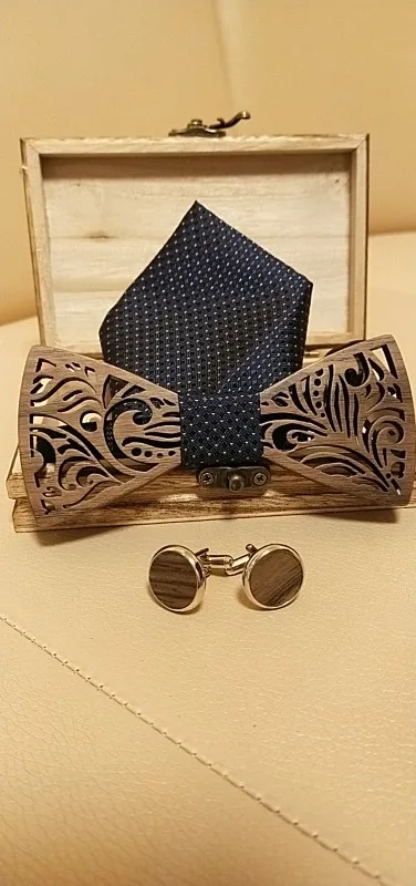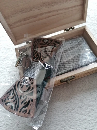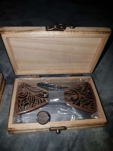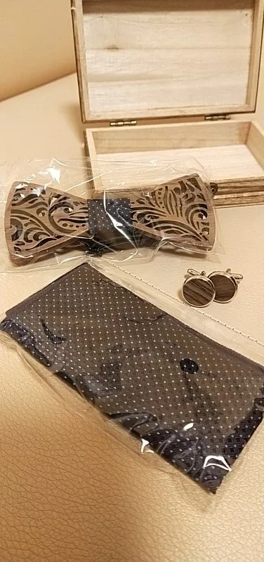 Очень шикарная и необычная бабочка! Выглядит очень стильно и элегантно, вносит некую «изюминку» в образ! Резная бабочка крепится на ремешке с качественной фурнитурой, регулируется по размеру. В комплект входят очень причудливые и изысканные запонки, подчеркивают индивидуальный стиль. Платок-паше видно что выполнен из высококачественной ткани, очень яркие и насыщенные цвета. Набор бережно упакован в деревянную упаковку, замочек в исправном состоянии. Посылка отслеживалась с момента оформления заказа до ее прибытия в пункт вручения. Пришло не так быстро, как хотелось бы. В целом очень изящное украшение, которое может послужить идеальным подарком.