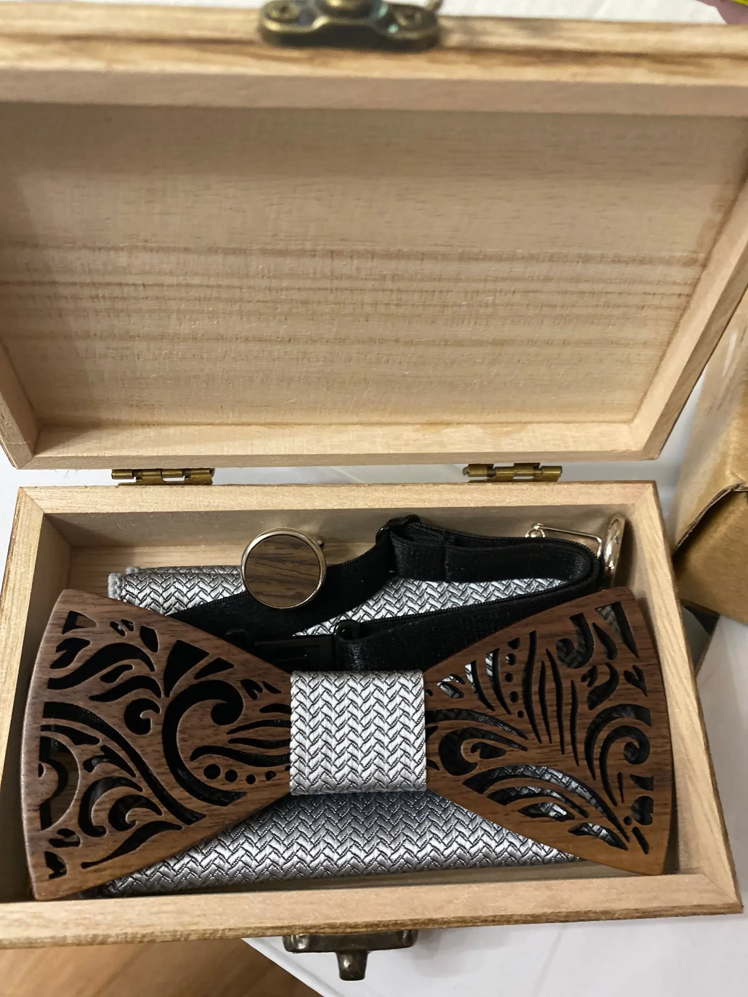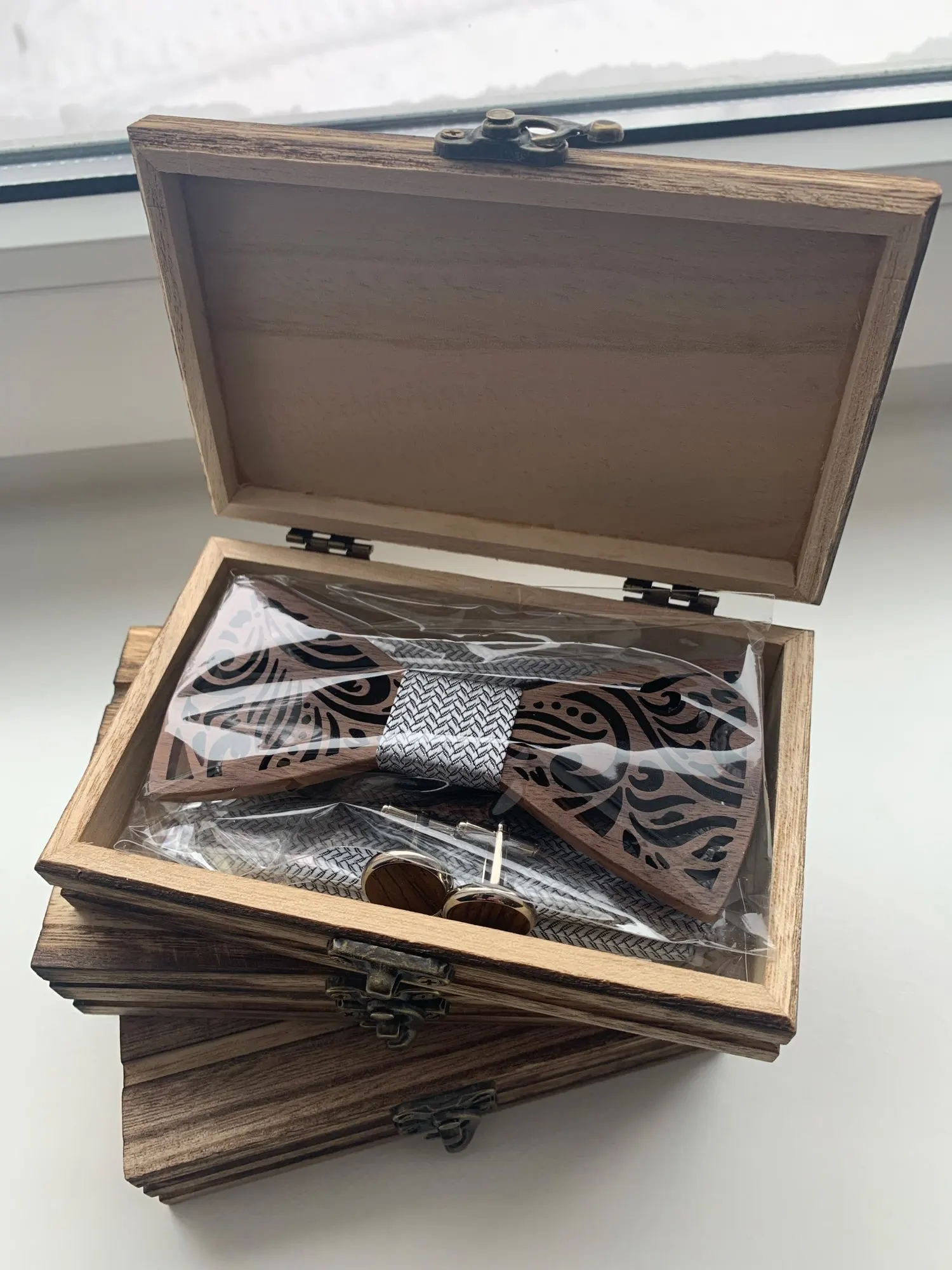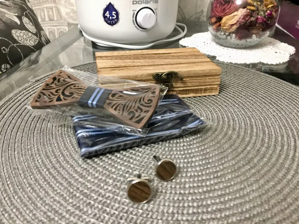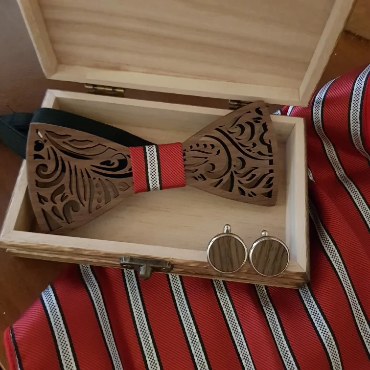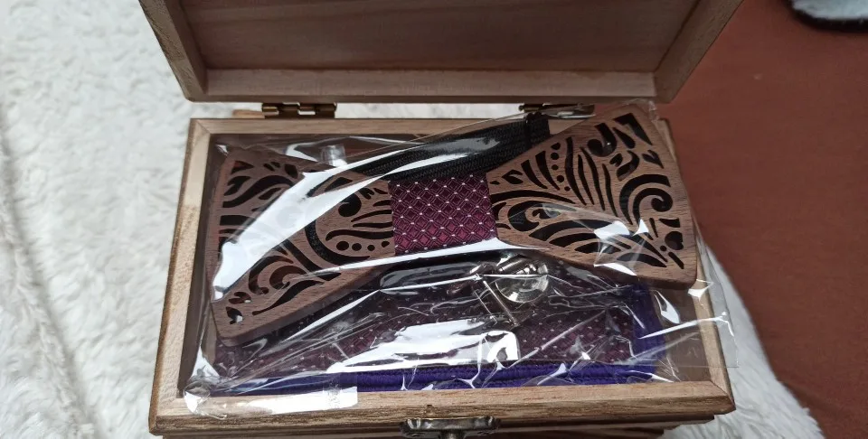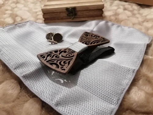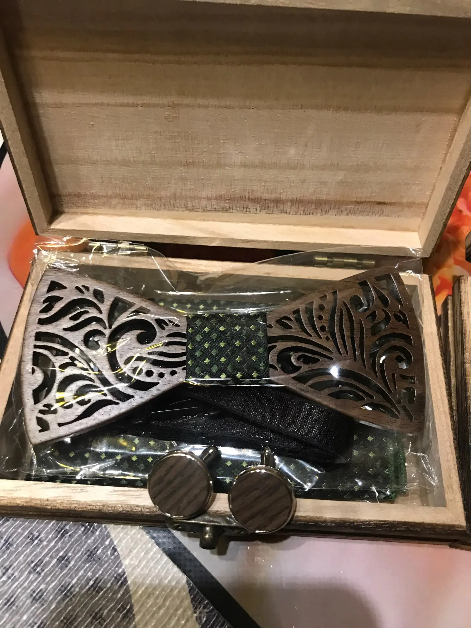 Очень шикарная и необычная бабочка! Выглядит очень стильно и элегантно, вносит некую «изюминку» в образ! Резная бабочка крепится на ремешке с качественной фурнитурой, регулируется по размеру. В комплект входят очень причудливые и изысканные запонки, подчеркивают индивидуальный стиль. Платок-паше видно что выполнен из высококачественной ткани, очень яркие и насыщенные цвета. Набор бережно упакован в деревянную упаковку, замочек в исправном состоянии. Посылка отслеживалась с момента оформления заказа до ее прибытия в пункт вручения. Пришло не так быстро, как хотелось бы. В целом очень изящное украшение, которое может послужить идеальным подарком.