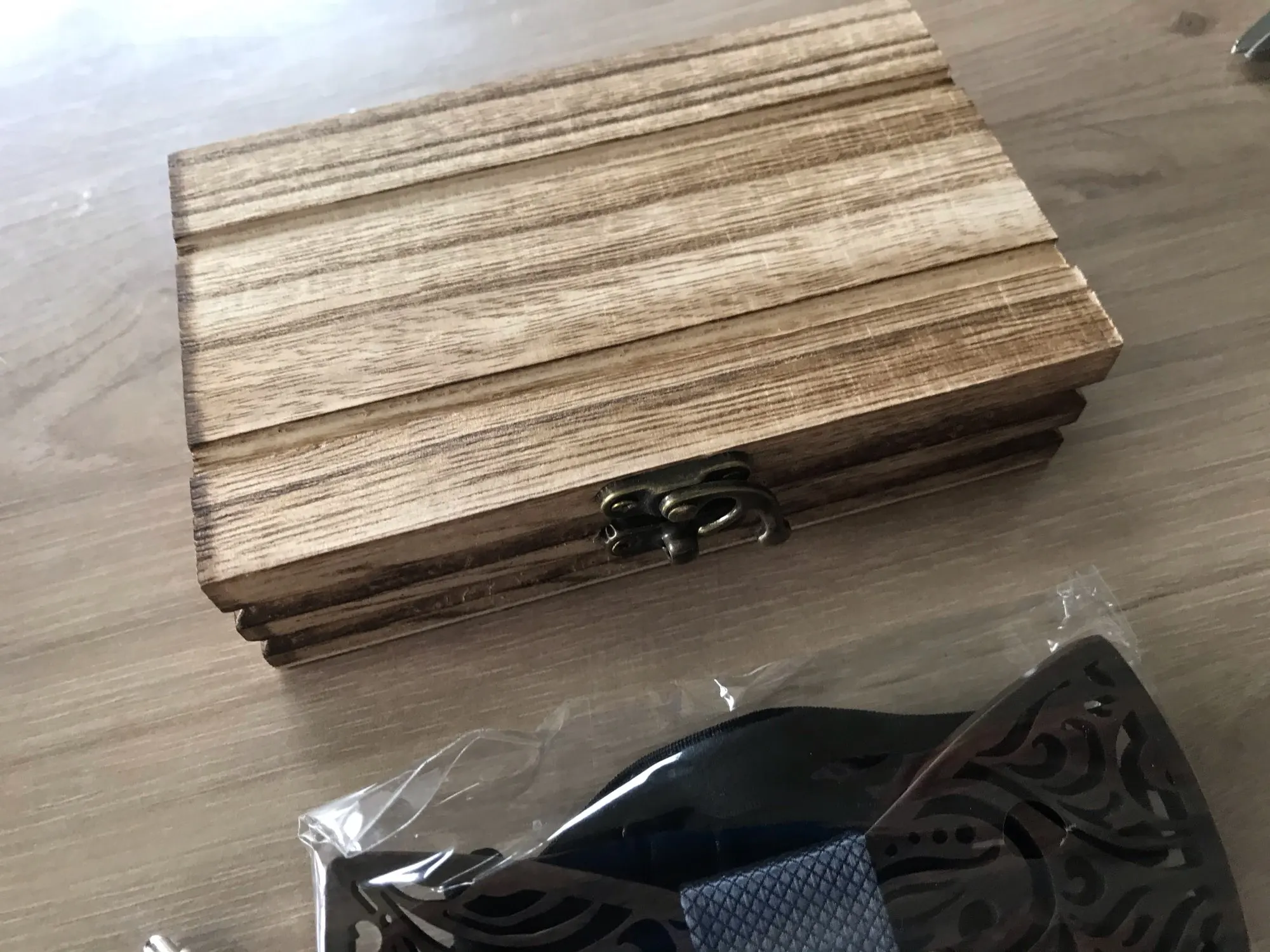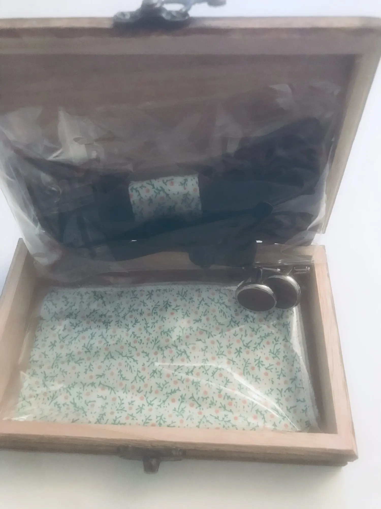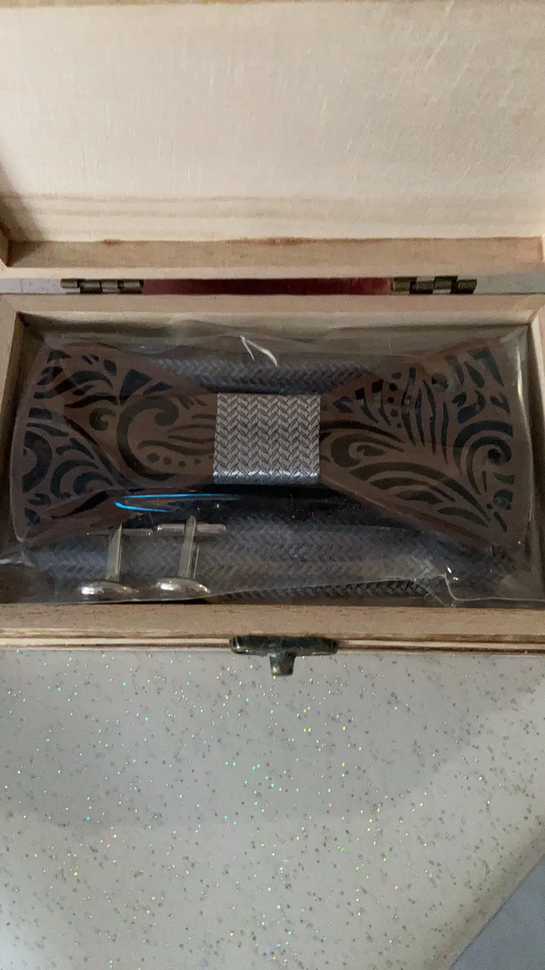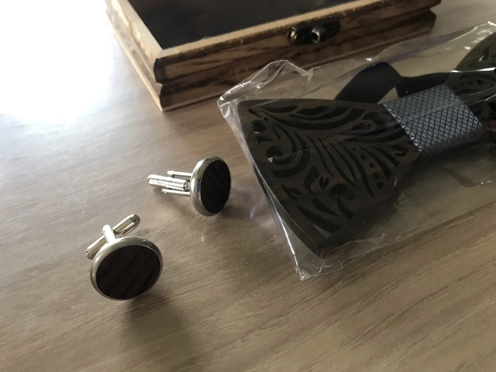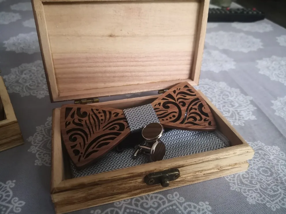 Очень шикарная и необычная бабочка! Выглядит очень стильно и элегантно, вносит некую «изюминку» в образ! Резная бабочка крепится на ремешке с качественной фурнитурой, регулируется по размеру. В комплект входят очень причудливые и изысканные запонки, подчеркивают индивидуальный стиль. Платок-паше видно что выполнен из высококачественной ткани, очень яркие и насыщенные цвета. Набор бережно упакован в деревянную упаковку, замочек в исправном состоянии. Посылка отслеживалась с момента оформления заказа до ее прибытия в пункт вручения. Пришло не так быстро, как хотелось бы. В целом очень изящное украшение, которое может послужить идеальным подарком.