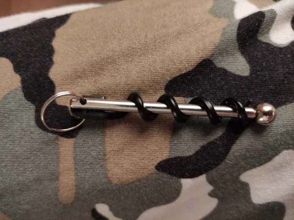 Очень удобный штопор, с учётом его маленького размера. Повесил его на кольцо с ключами :)) Думаю, лучше его дополнить небольшим карабином, вместо крепёжного колечка.