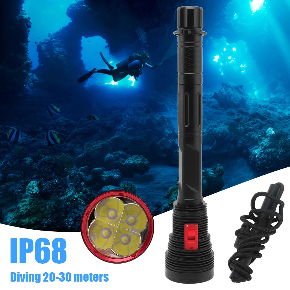 Источник питания: 4*26650 батареи (не включены)Расстояние освещения: 100-200 мМодель светодиодных бусин: XPH70.2 LEDЦветовая температура: 5500-6000KСтепень водонепроницаемости: IP68Глубина погружения: 20-30 м