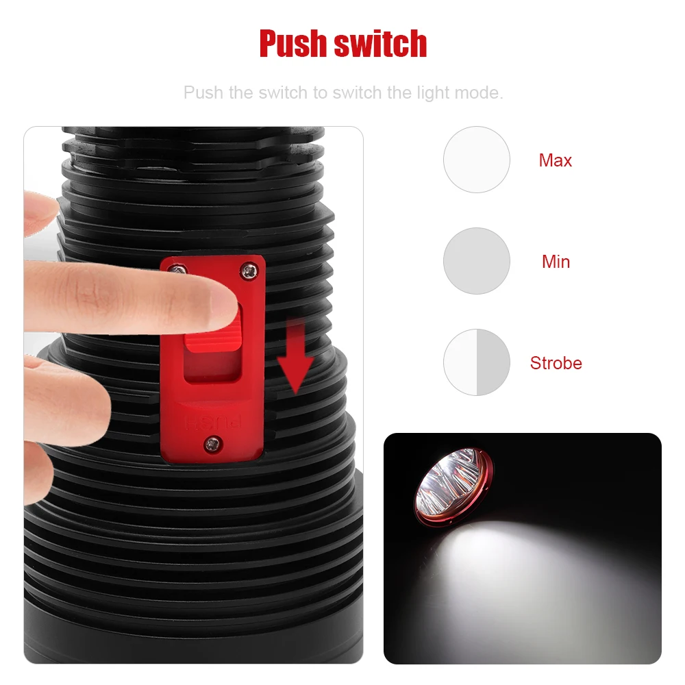 ● Мощный на 10000 люмен: Максимальная мощность подводного фонарика составляет 10000 люмен, у него имеется режим очень яркого света, который отлично подходит для подводных активностей.● 3 режима: яркий/слабый/стробоскоп. Это позволяет регулировать яркость в соответствии с подводной средой, экономить энергию.● Глубина погружения до 30 метров: ip68водонепроницаемый уровень делает этот фонарь для дайвинга надежным при погружении под воду, для поисков, чрезвычайных ситуаций, приключенческих видов спорта на открытом воздухе.● Поверхностные технологии: современные бриллианты с твердым анодированием.● Линзы: оптическое стекло с двусторонним покрытием, со светопередачей до 91%.● Отражатель: материал из алюминиевого сплава, устойчивый к удару и к царапинам, не стареет, устойчив к огню