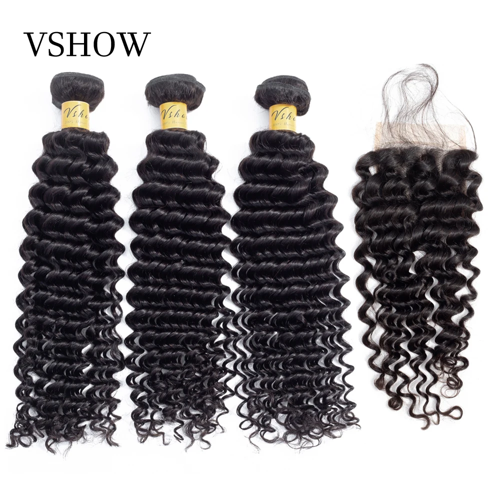 Бразильская глубокая волна пряди с Закрытие 4*4 Бесплатная Часть Кружева Закрытие 3 пряди с закрытием VSHOW Remy человеческие волосы пряди с закрытием