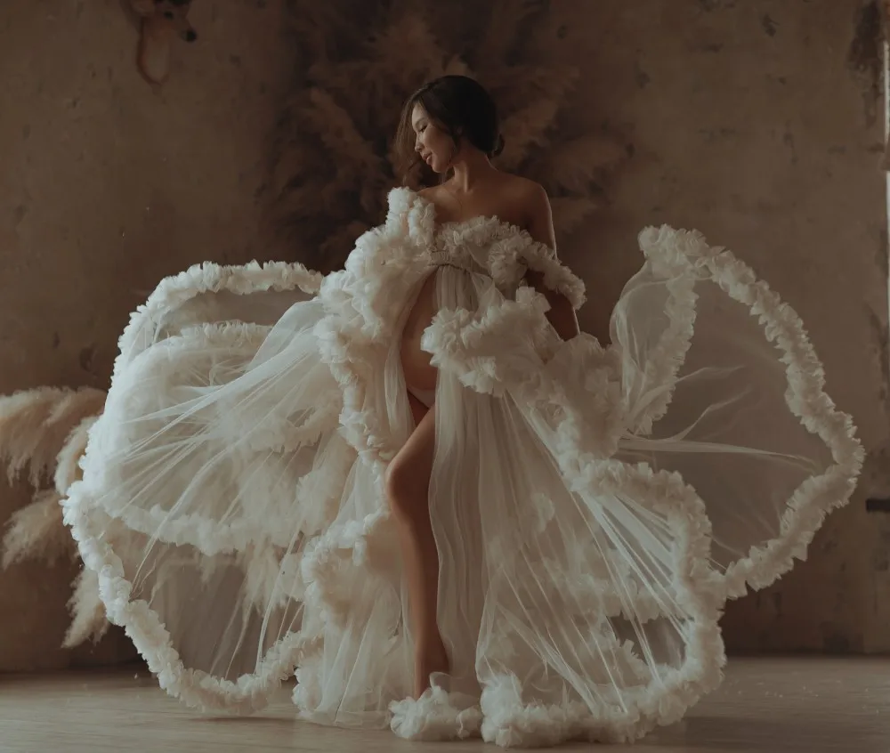 Платье для беременных, из тюля, с длинным рукавом, с пышными оборками