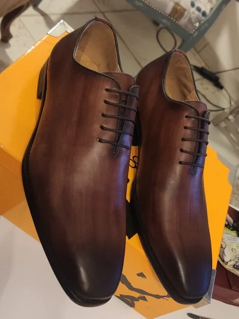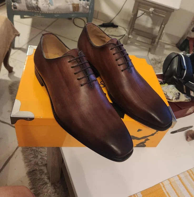 Опять же, обувь очень красивая, отличного качества и очень хорошо упакована. Нечего сказать еще раз. Вы можете купить у этого продавца с закрытыми глазами. Откровенно трудно найти лучшее соотношение цены и качества на этом типе продукта. Я купил те же самые в черном цвете, я ношу их очень регулярно, и они не двигались, если вы хорошо сохраняете свою обувь, не беспокойтесь. Для этого коричневого цвета я советую вам использовать коричневый круглый крем немного темнее, чем основной цвет обуви, который выйдет из конька (см. Мои фотографии). На фотографиях я еще не заставил обувь блестить, я просто округла их. Превосходный крем марки saphir идеально подходит.
