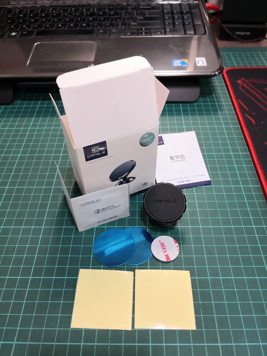 еще не наклеил. что то больно маленькая липучка к торпеде крепится. так, вроде качественно, добротно. посмотрим, как в работе покажет. в комплекте пришли металлические пластинки в чехол телефона. вещь нужная.