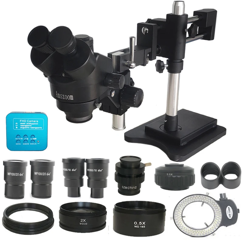 1 тринокулярная Стерео Зум-головка1x пара супер Widefield окуляра высокой точки WF10X окуляры1x 0.5X вспомогательная цель WD 165 мм 1x 2.0X вспомогательная цель WD 30 мм